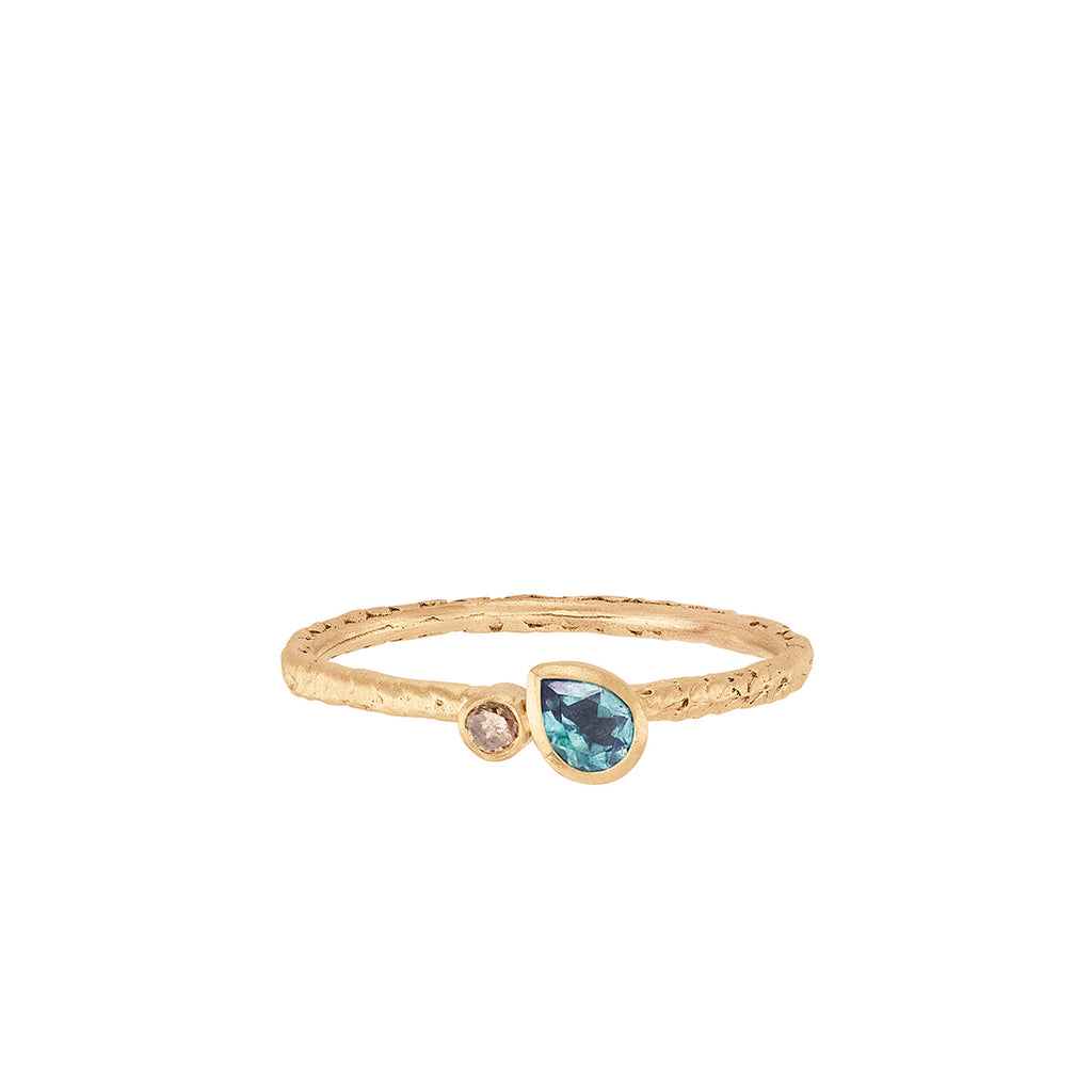 The Catkin Off-Set Ring features a pear-cut blue tourmaline paired with a champagne diamond, set in 9ct SMO gold with a softly textured band. Balancing asymmetry and refinement, the design highlights the vivid interplay of colour and light between the two