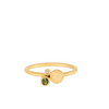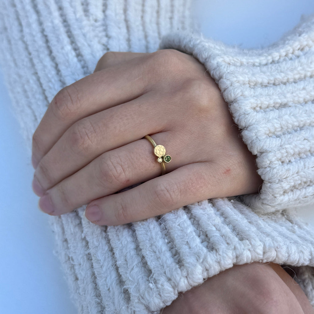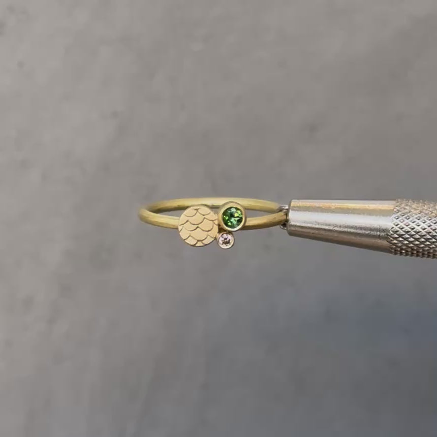 Earthy tones from the tourmaline's deep grassy green and the champagne diamond's understated elegance sit elegantly atop a matt-finished 18k yellow gold band alongside Alison's Catkin gold coin. A pairing of silky gold finishes, colour and texture creates a unique vintage-inspired ring.