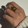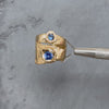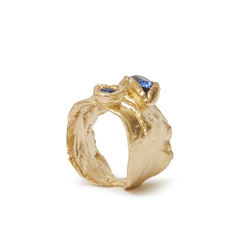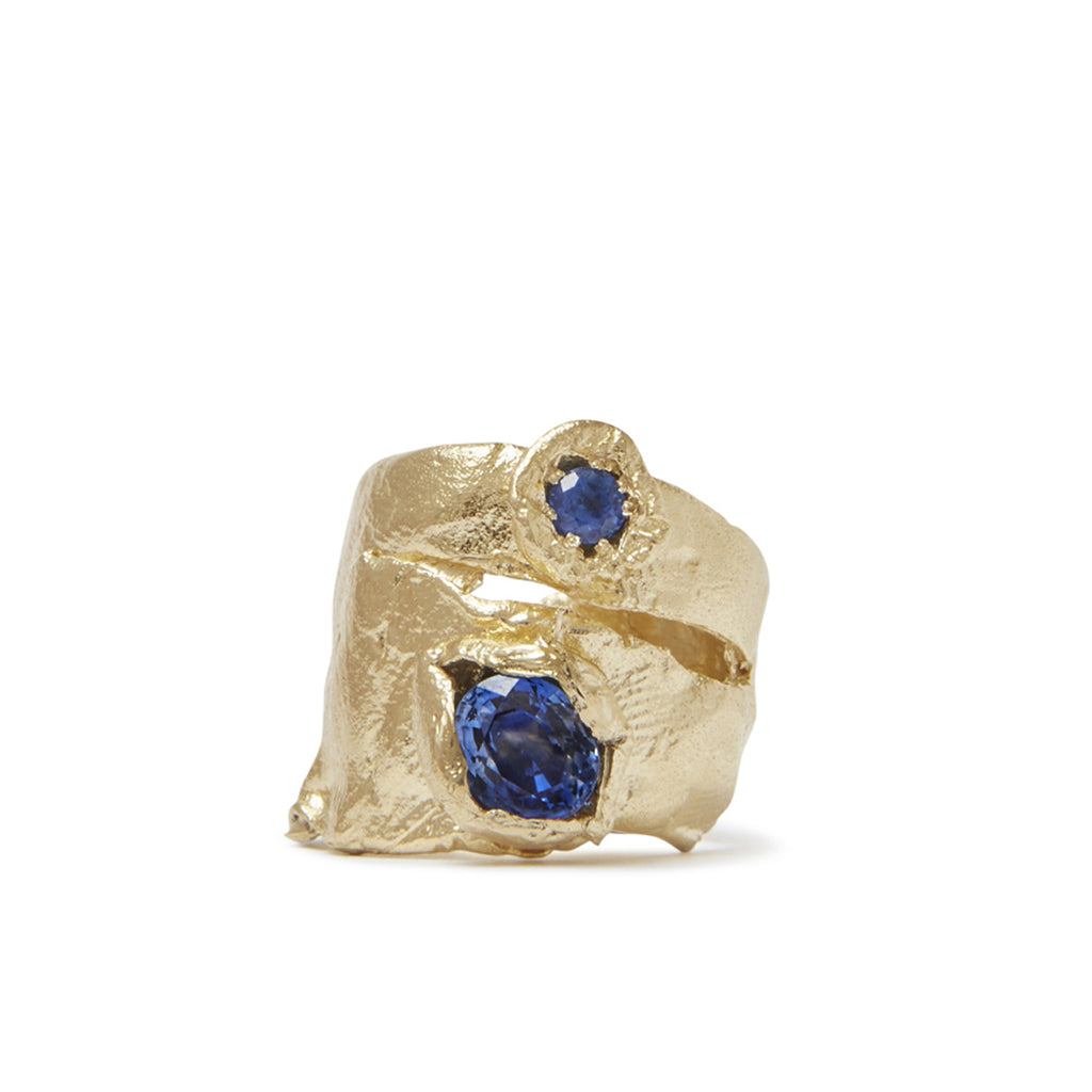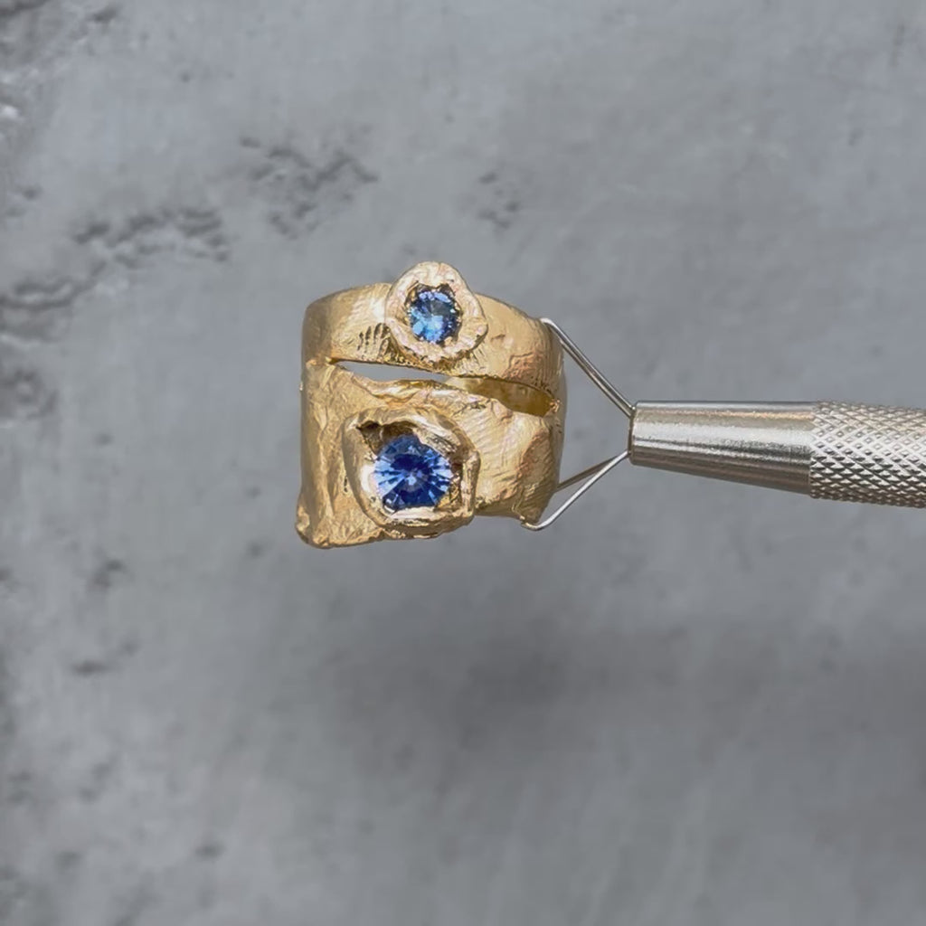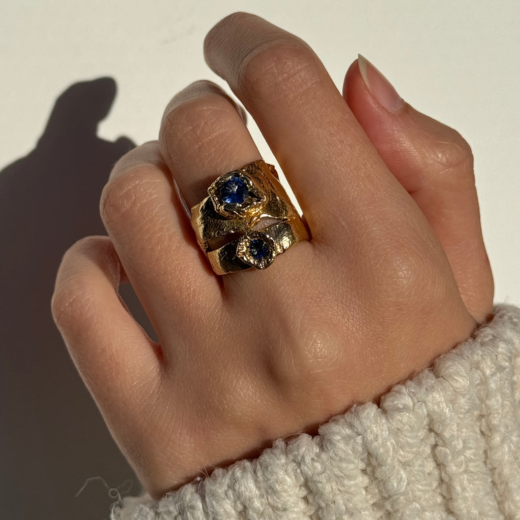 This unique 14k yellow gold ring features two striking blue sapphires embedded within an organic, textured band. The sculptural design creates the illusion of two rings in one, adding a distinctive touch to any jewellery collection while remaining understated enough for everyday wear.