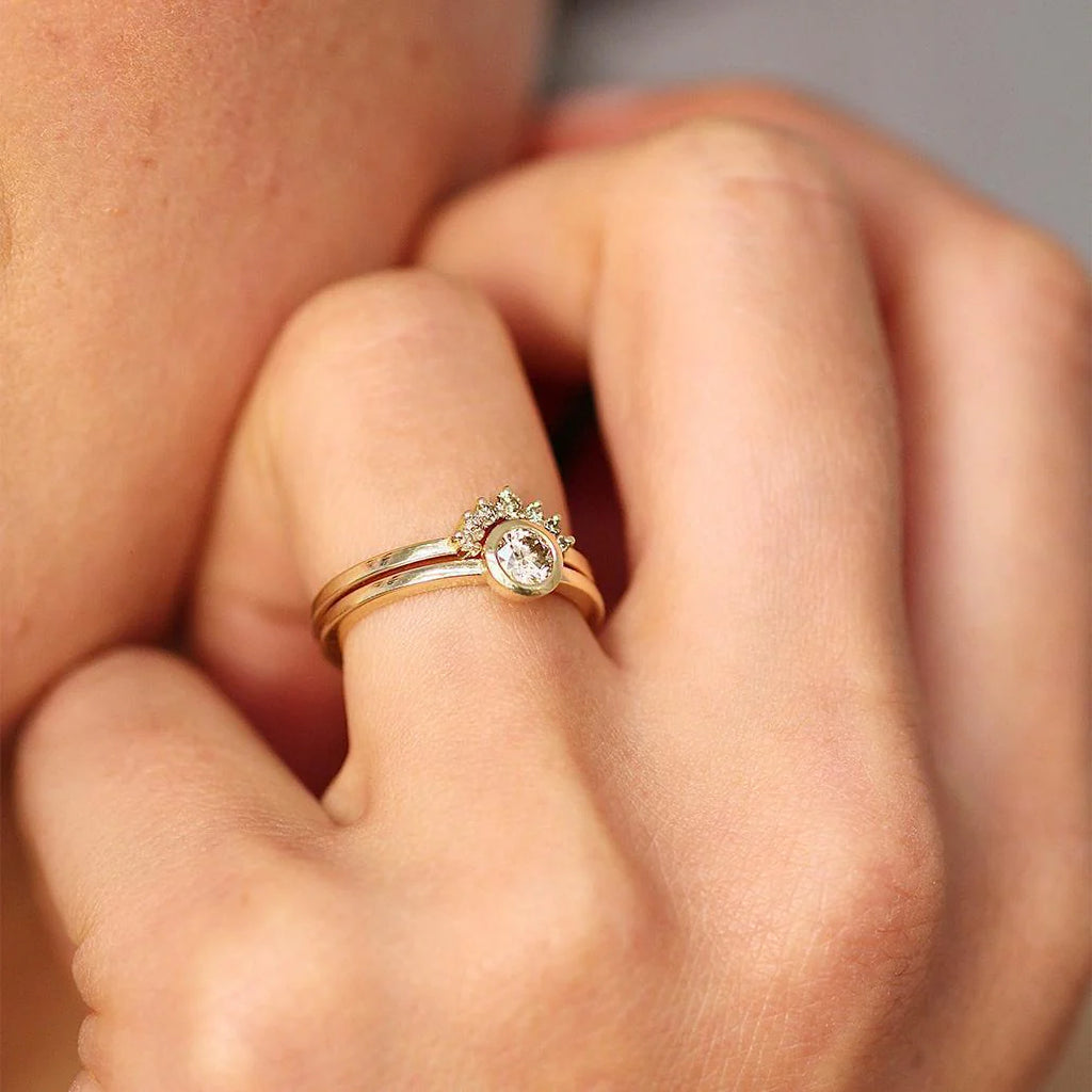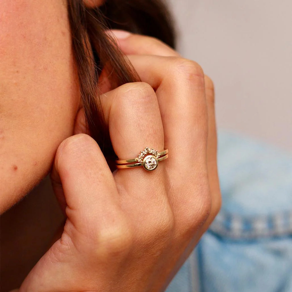 The Chandri Champagne Nesting Ring is set with a fine line of champagne diamonds in 14k yellow gold. The gentle curve of the band allows it to pair seamlessly with engagement rings or other bands, bringing a sense of balance and quiet refinement. Worn alone, it offers an understated brilliance that highlights its thoughtful design.