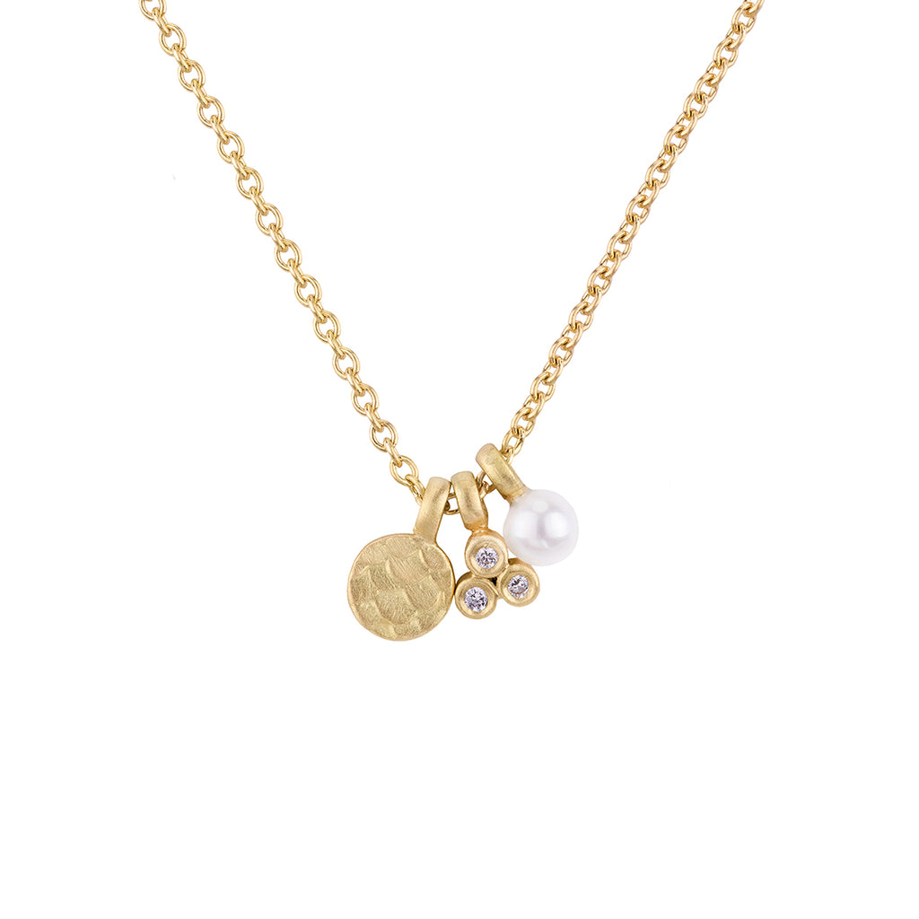 This necklace brings together three of Alison Macleod’s signature elements - a softly textured coin charm, a freshwater pearl, and a trio of diamonds. Each detail is suspended from an 18ct SMO gold chain, creating a gentle balance of texture and light. The piece captures Alison’s thoughtful approach to design, where form and material speak with quiet harmony.