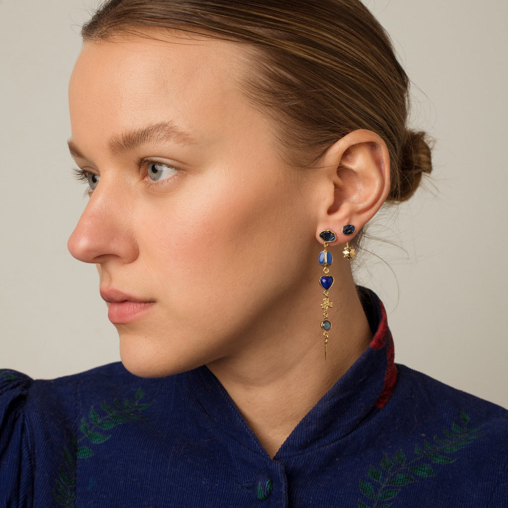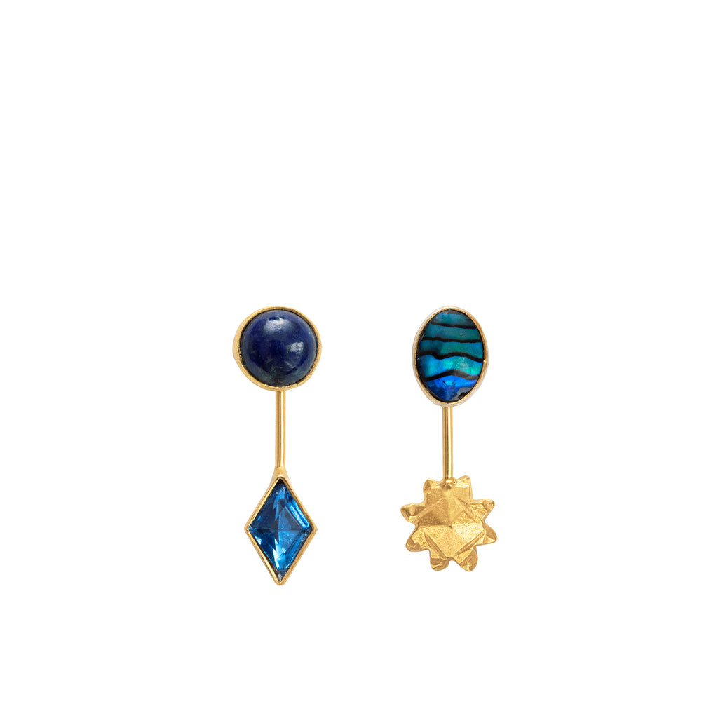 The Detachable Drop Earrings feature a mixture of lapis, abalone and vintage rhinestones set in 18k gold plated silver, with detachable drops in colour co-ordinated blues.