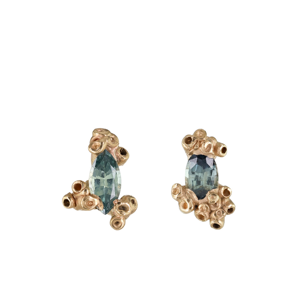 Golden barnacles cast with seaweed toned green sapphires, perfect as everyday earrings.