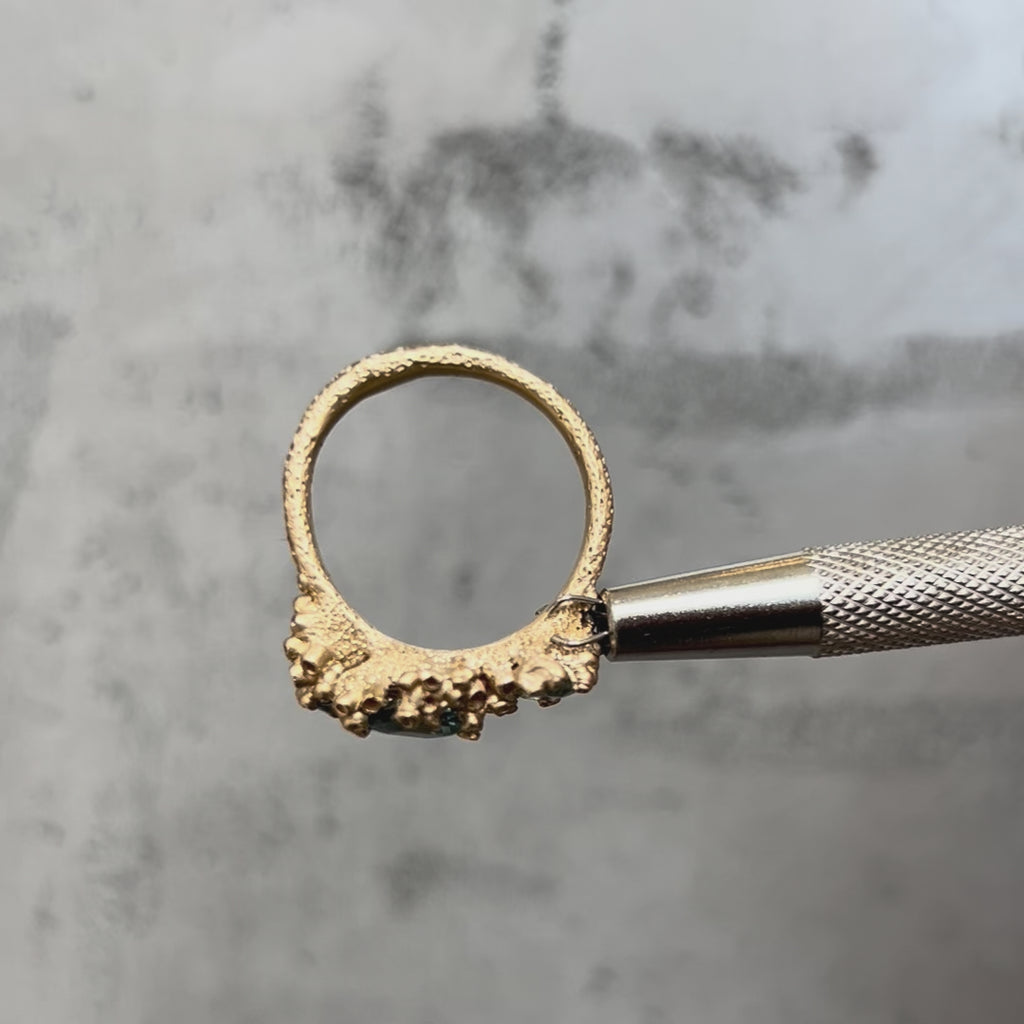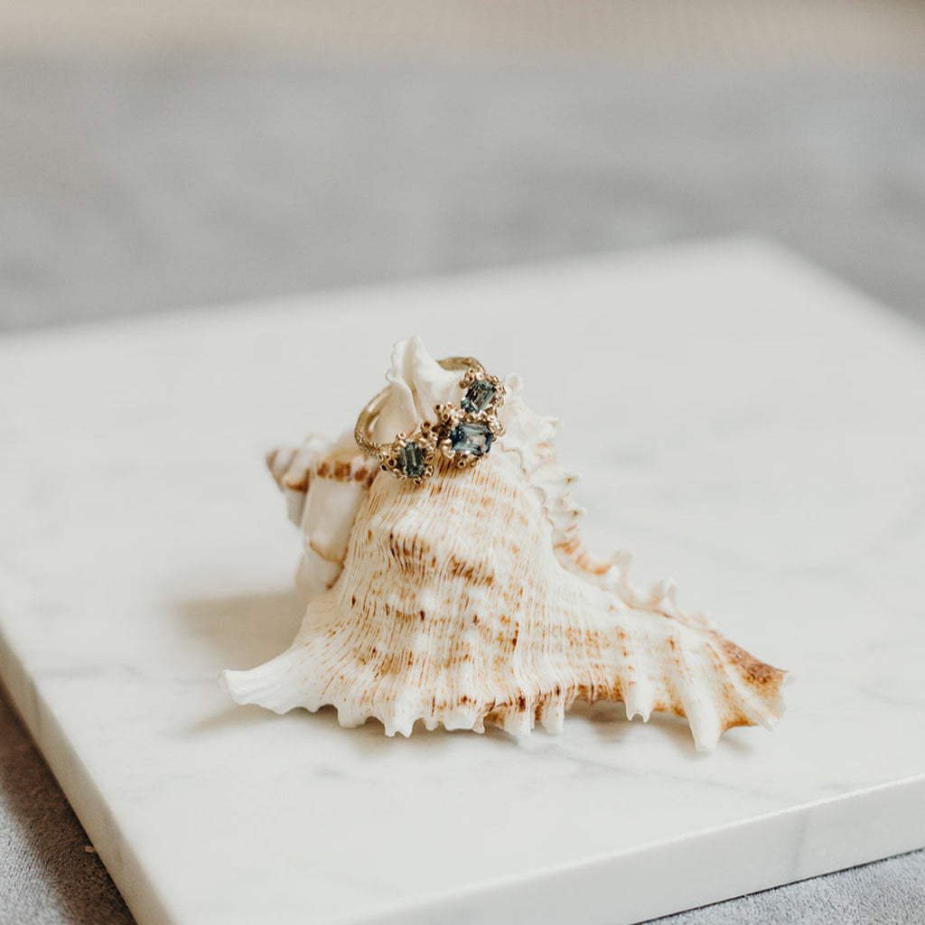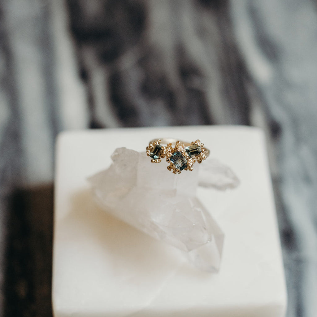 A beautifully textured band encrusted with golden barnacles, organically set with three emerald cut sapphires. The gentle tones of the stones and the sea-worn finish give the piece a quiet, underwater magic. An ideal alternative engagement ring for those drawn to the mystery and beauty of the sea.