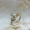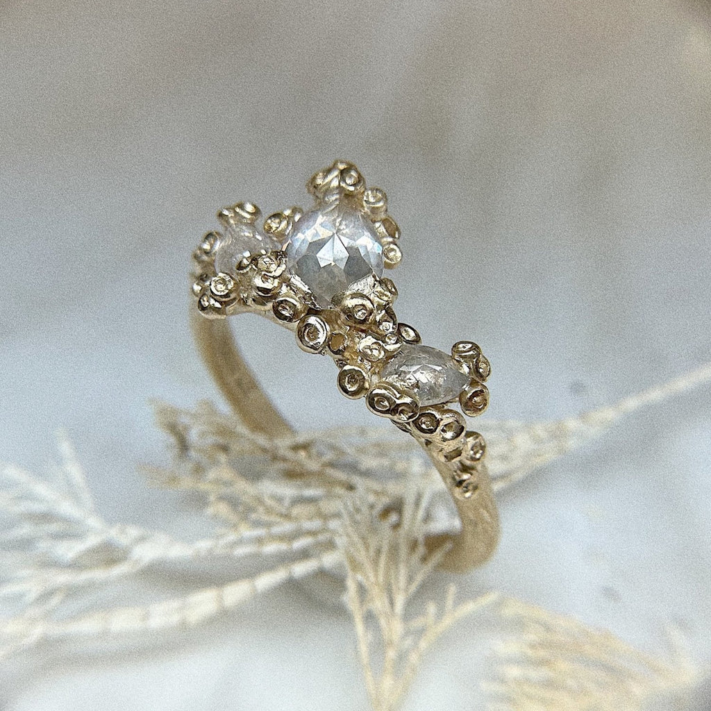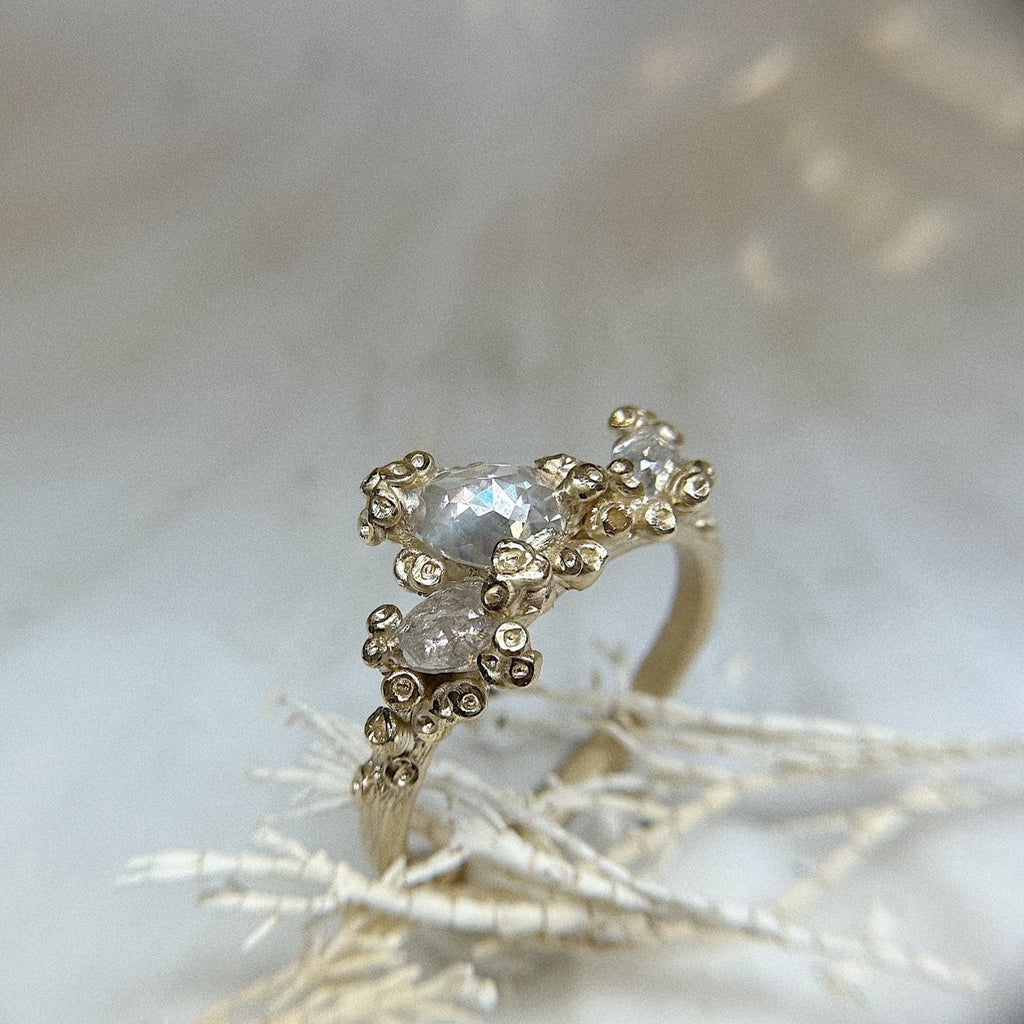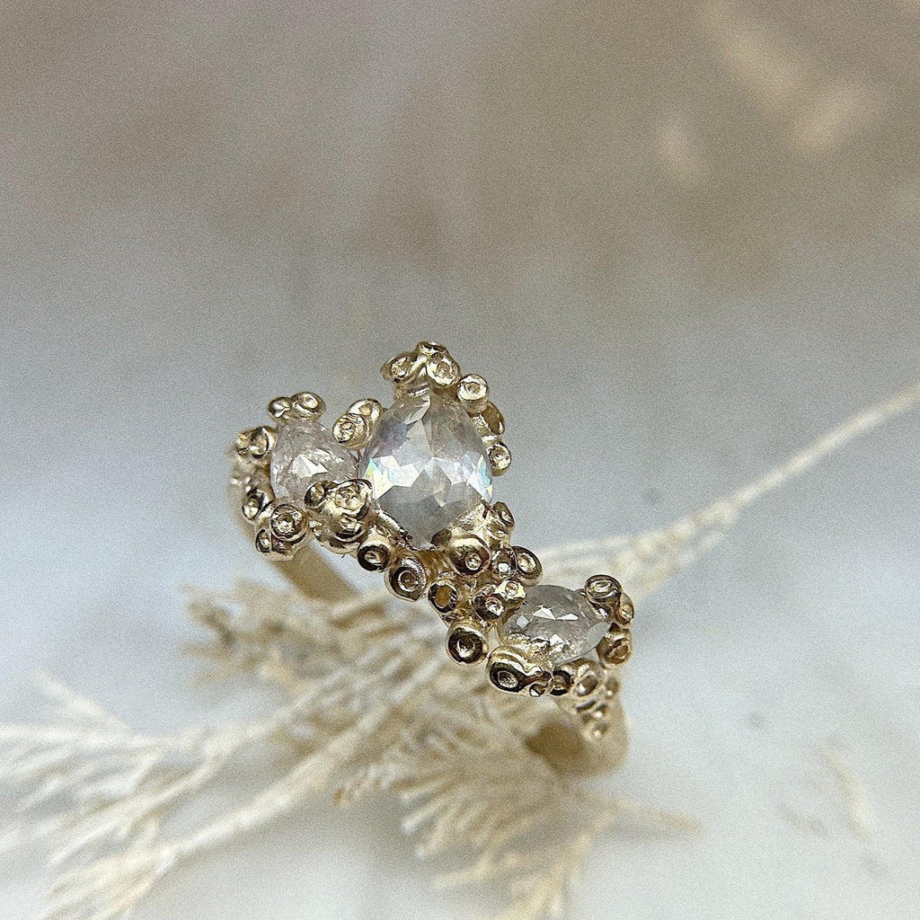 The Ocean Wave Ring features a dreamy cluster of pear-shaped rose-cut diamonds in soft opalescent and champagne tones. Nestled among golden barnacle details, the stones shimmer against the sandy-toned 9k yellow gold, evoking the beauty of treasures washed ashore.