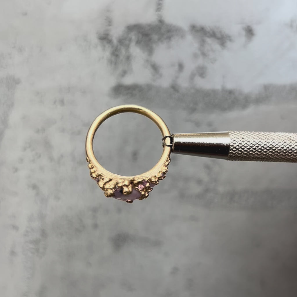 The Opalescent Pink Sapphire Barnacle Ring is an otherworldly piece handcrafted in 9k yellow gold, featuring a cushion-cut opalescent sapphire at its centre, surrounded by five smaller sapphires in an asymmetric cluster. Golden barnacle details form around the stones, creating an organic, oceanic design that feels like a true mermaid’s treasure.