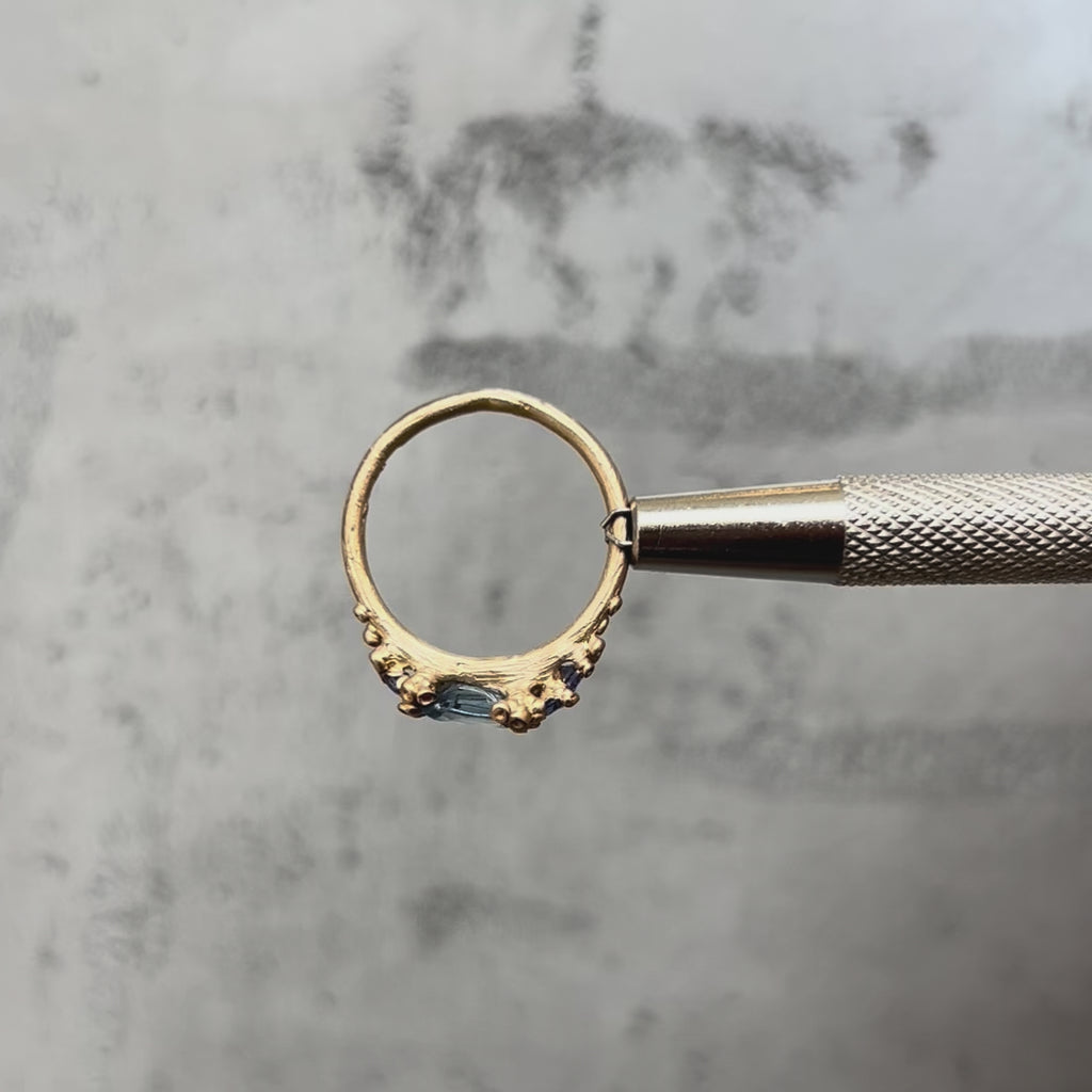 his otherworldly ring is handcrafted in 9ct yellow gold, set with a central oval blue sapphire and a cluster of purple sapphires—making it a true mermaid’s treasure. Arranged in a beautifully asymmetric style with golden barnacles, it would make a perfect minimal dress ring or a distinctive alternative engagement ring.