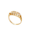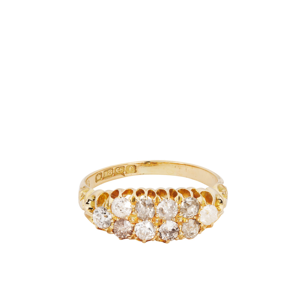 en old round cut diamonds are nestled within delicate golden prong settings, skilfully arranged in a captivating curved cluster to catch the light. Reflecting the
