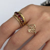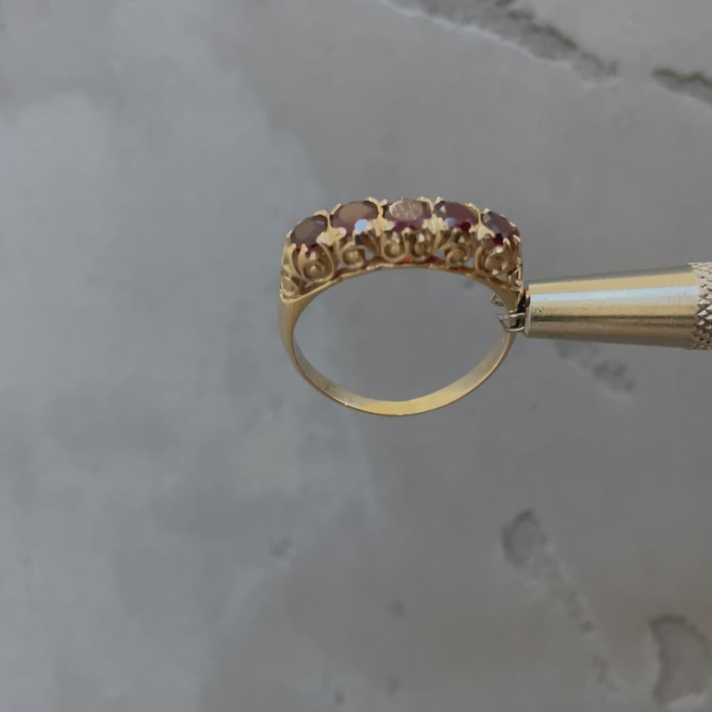 This unique ring features five deep red garnets set in a swirling claw setting, creating a striking, elevated design. The round-cut stones sit proudly atop a polished yellow metal band, which is stamped ‘9ct’. A timeless piece with a rich, regal presence, perfect for anyone looking to add a colourful, one-of-a-kind heirloom to their collection.