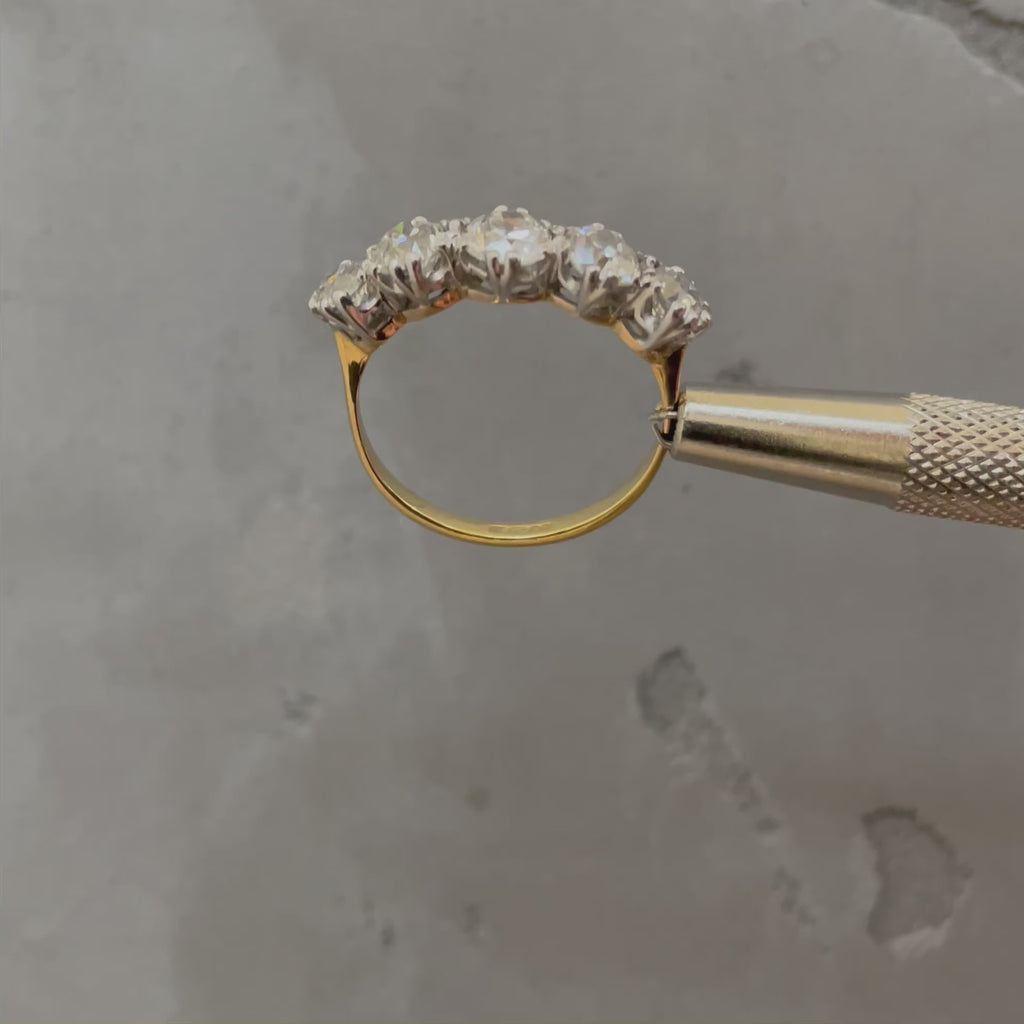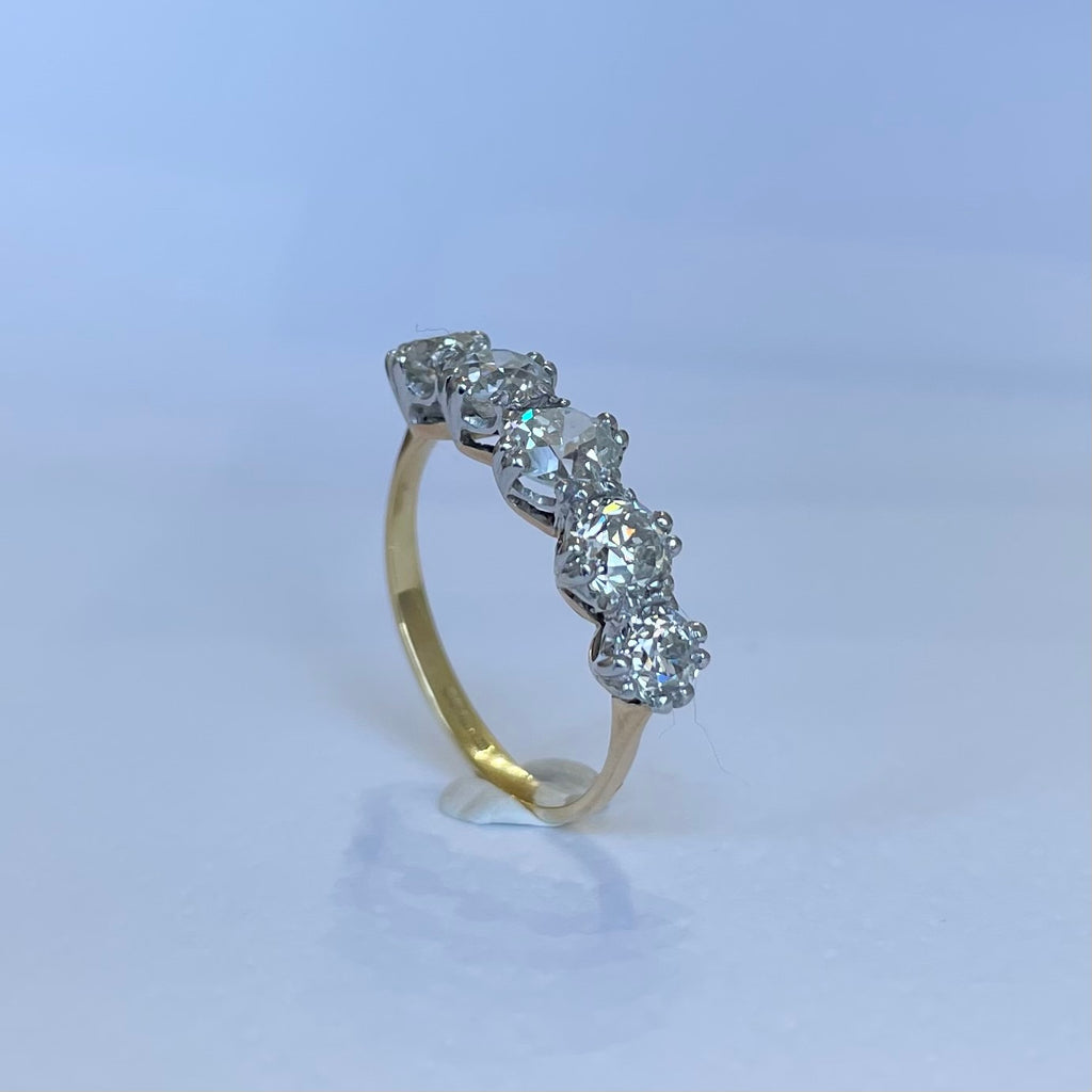 This sparkling five-stone engagement ring comprises five antique old round-cut bright white diamonds from the early 1900s between 1900-1930s - a total of approximately 1.85carats. A timeless syle, this ring is just waiting to be paired with a beautiful modern textured band or worn alone in all its glory. Each old cut diamond is set in a claw setting, with graduated transition cut diamonds in a lovely curve that frames the finger. The diamonds have previously been remodelled and reset into this 18ct yellow gold ring shank.