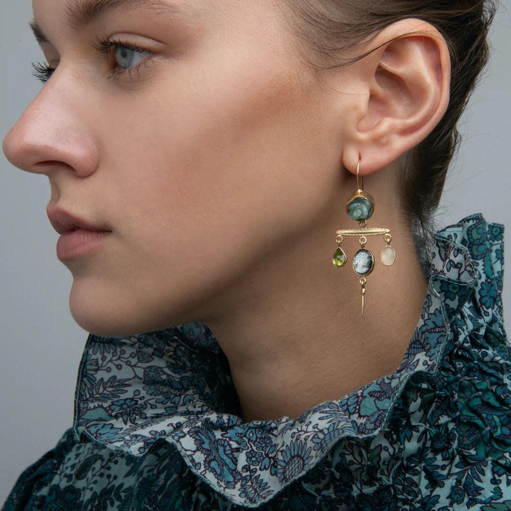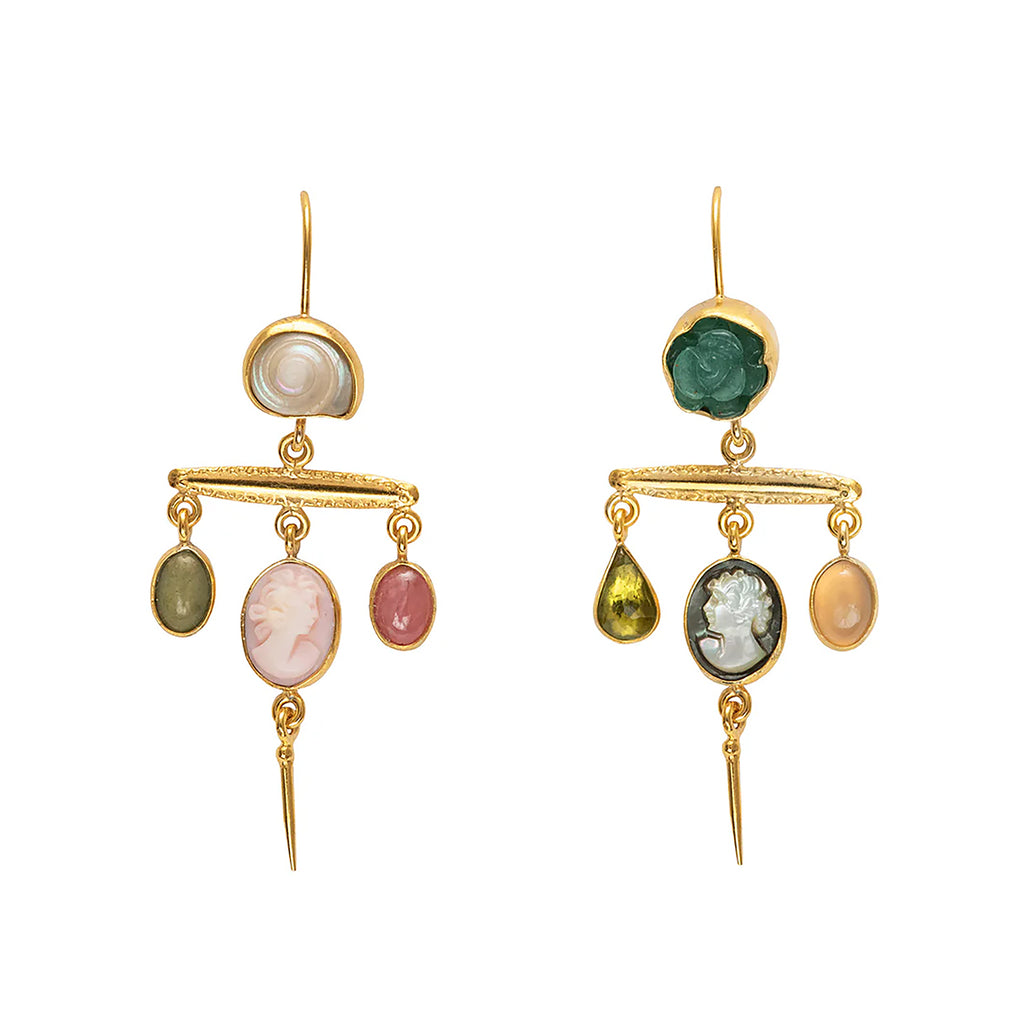 Materials: Fairtrade 18k gold-plated recycled silver, sardonyx, cameo, chalcedony, peridot, prehnite, rhodochrosite and shell