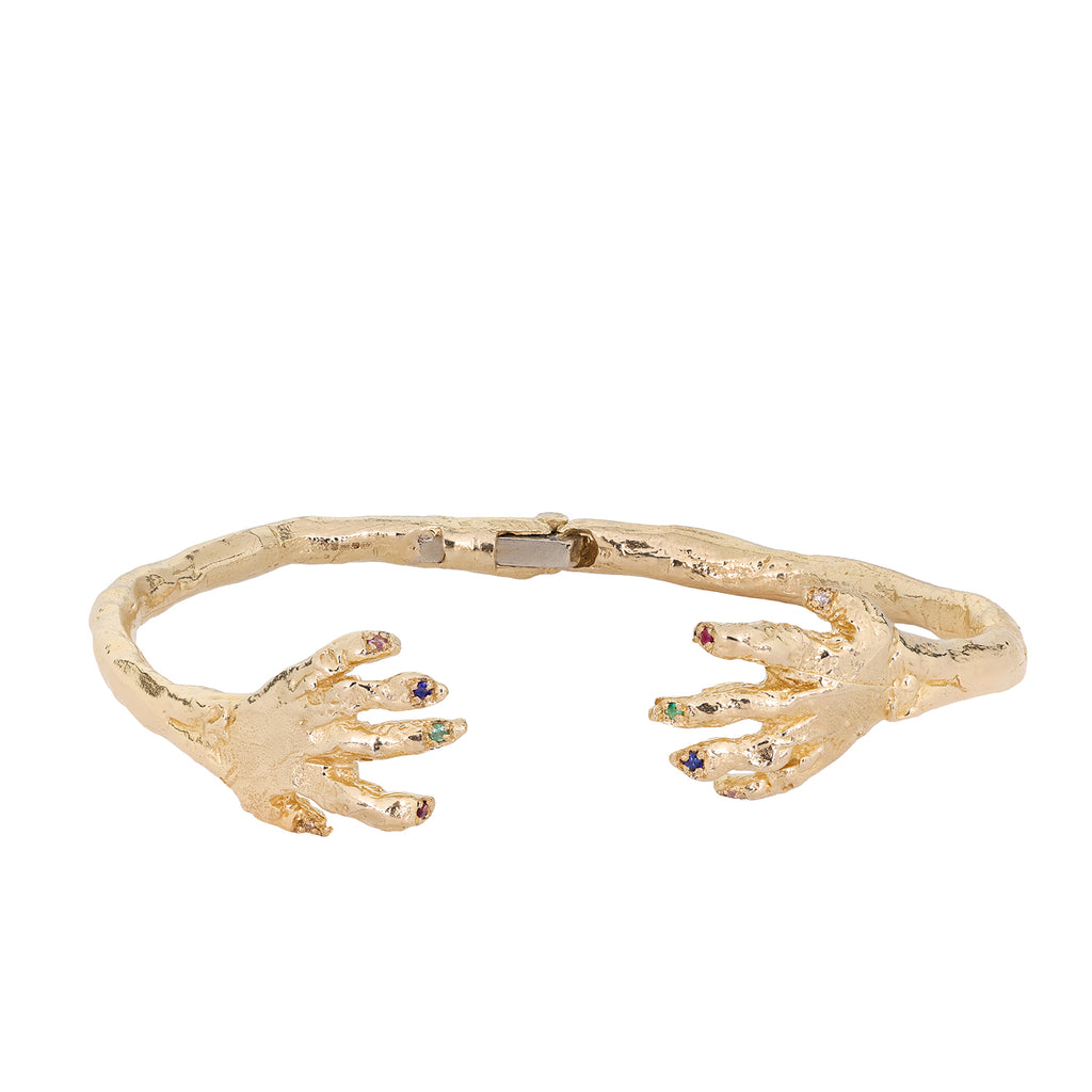 The Hinged Hands Bracelet is crafted from textured 14k gold, designed to wrap beautifully around the wrist, it features two delicately sculpted hands reaching towards each other. The hands are detailed with coloured gemstones and diamonds set as the 'nails', adding a touch of sparkle and pop of colour that enhances the warmth of the gold. A striking and refined piece, this bracelet brings together artistry and elegance.