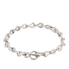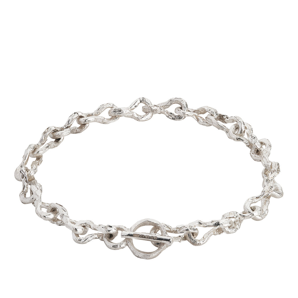 The Contort Bracelet by The Ouze is a handcrafted chain with uniquely twisted round links and a bespoke T-bar fastener. Each sterling silver link is cast, polished and soldered together by hand.