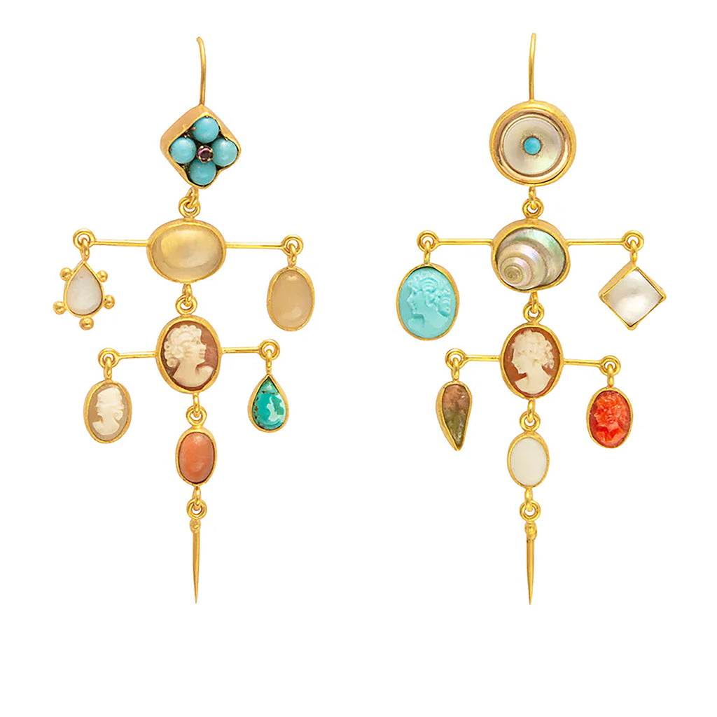 Materials: Fairtrade 18k gold-plated recycled silver, antique enamel button, cameo, coral, moonstone, opal, rose quartz, shell, tourmaline, turquoise and vintage glass