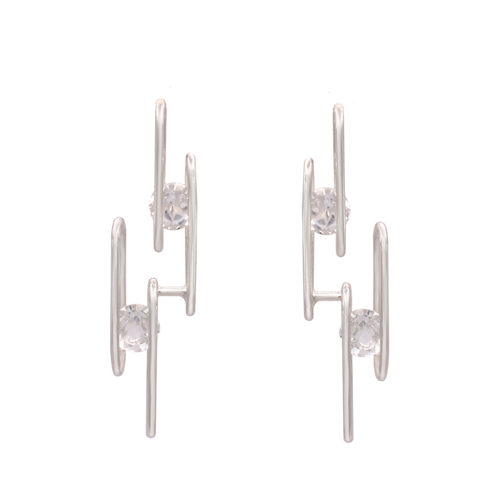 These earrings feature white topaz gemstones set within a clean, geometric arrangement of recycled sterling silver. The linear wire design highlights the brilliance of the stones, creating a refined and contemporary look.
