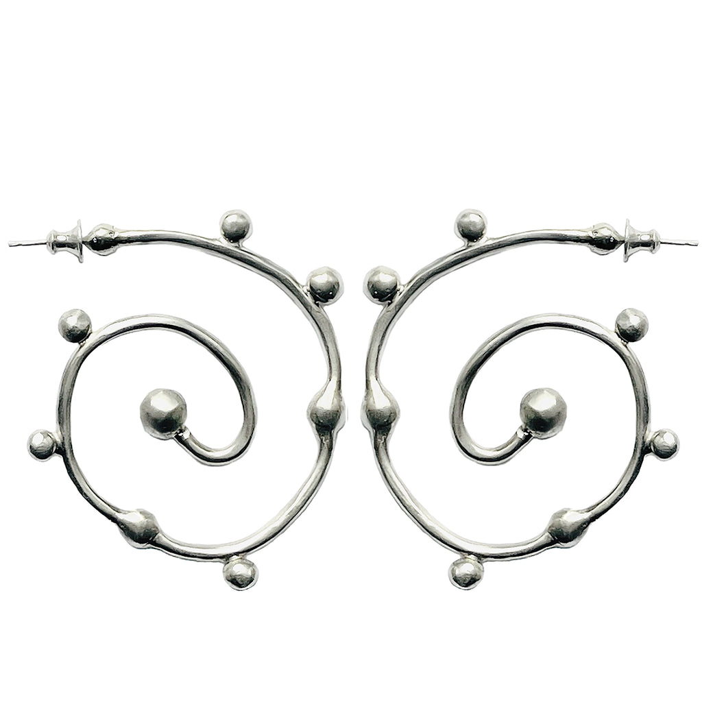 These silver spiral earrings sweep outward into a broad, open coil, punctuated with raised silver beads along the curve and at the centre. The interplay of form and texture gives them a sculptural quality, while the satin finish softens the metal’s surface, catching the light in a subtle, understated way.