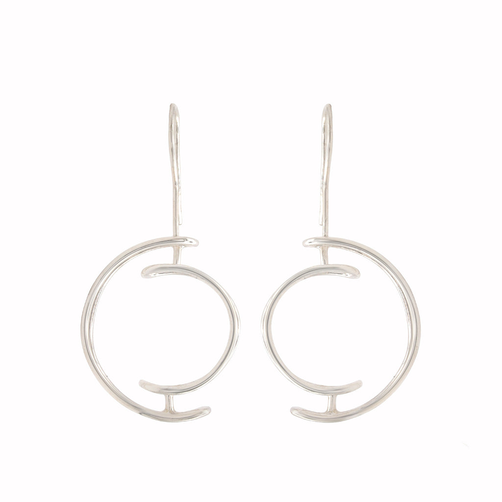 The Orb Drop Earrings feature a striking circular form with open, sculptural detailing that gives them a bold yet balanced presence. Crafted in recycled sterling silver, their clean lines and suspended design highlight a sense of movement and lightness.