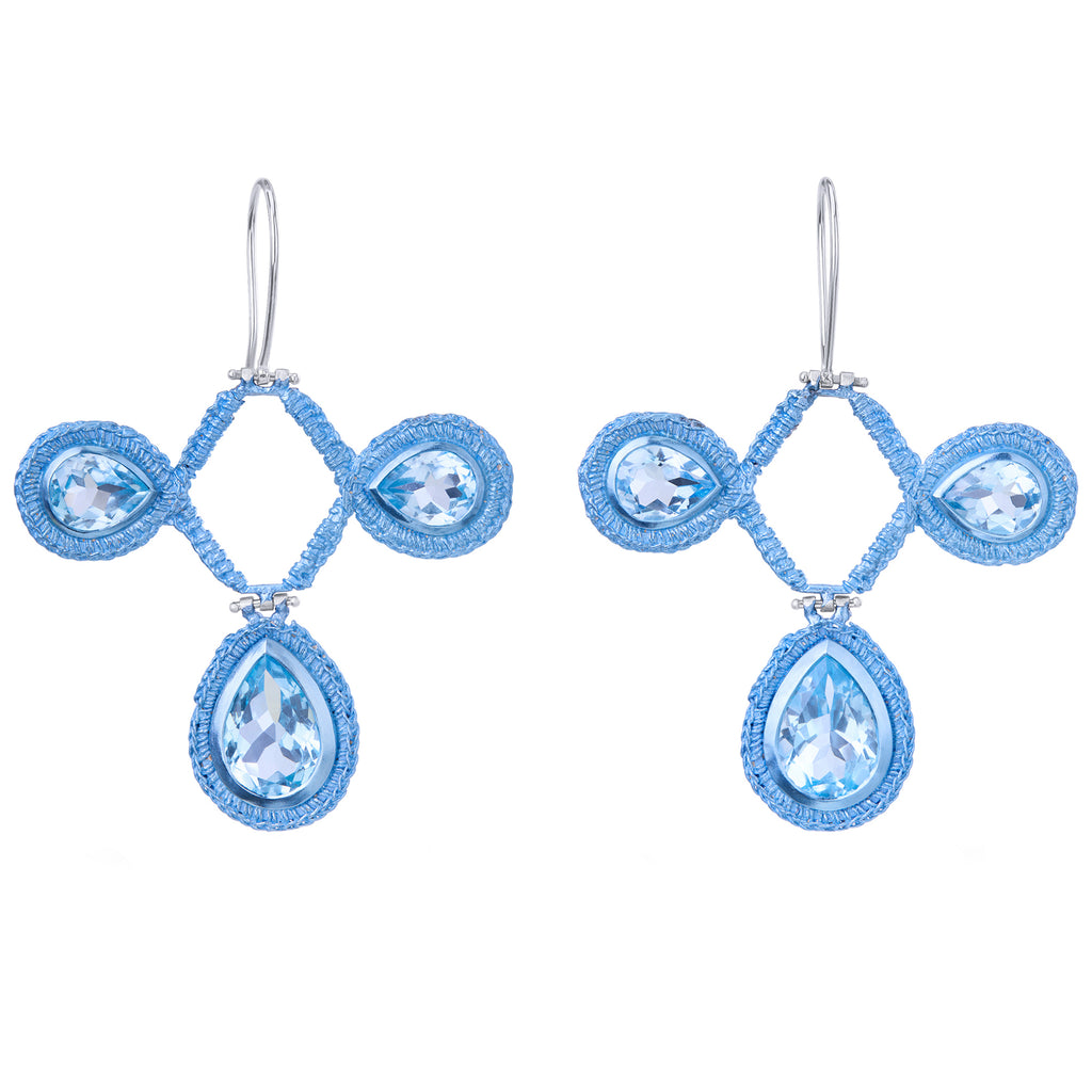 The Regency Demi Chandelier Earrings feature a total of six faceted pear-cut Sky Blue Topaz gemstones set in silver, finished with a pale blue ceramic coating. The colour drench effect enhances the gemstones and references embroidered cloth. These bold, colourful statement earrings have hinged sections that move and catch the light beautifully.