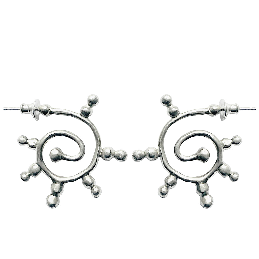 These spiral earrings are crafted in silver, their coiled design edged with a series of raised bead details. The satin finish lends a soft texture, highlighting the handmade character of the piece.