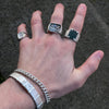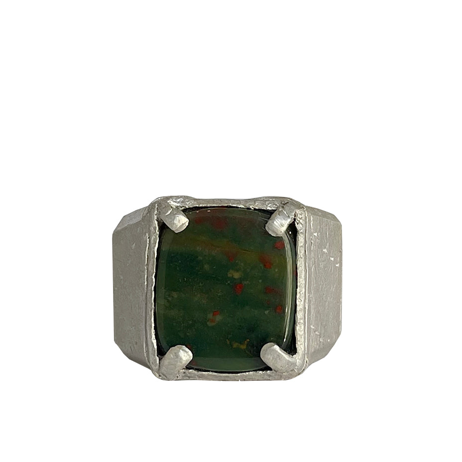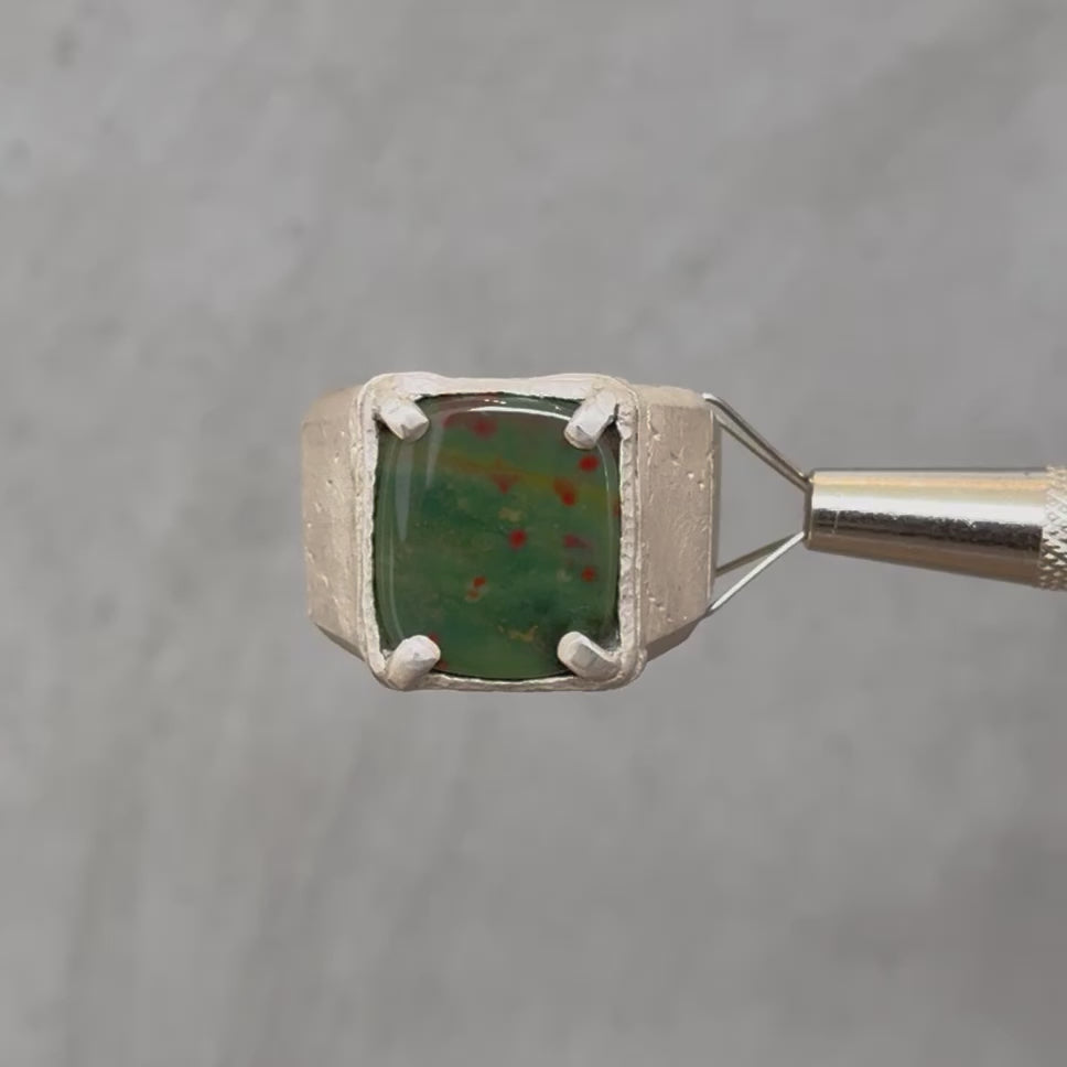 A unique chunky sterling silver signet ring featuring a rugged, textured surface finish, set with a deep green and red speckled bloodstone.
