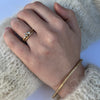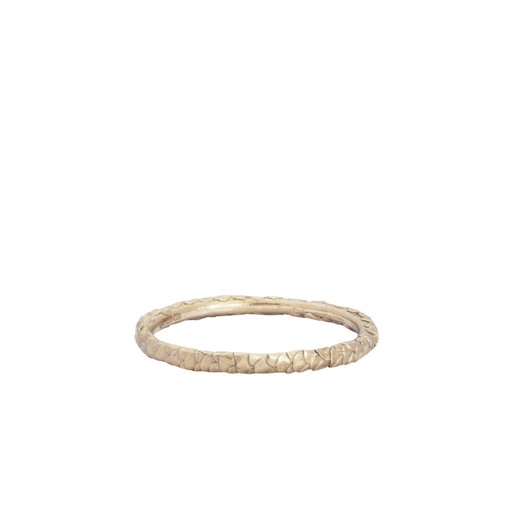 This slim patterned band is perfect for stacking or as a skinny wedding ring. Its round profile is wrapped with tiny layered disks subtly representing the Spring catkin flower.