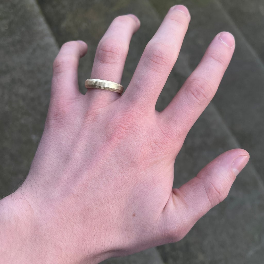 This delicately textured band has a spun pattern and a natural curved chamfered edge. The spun texture may vary very slightly ring to ring. Scottish jeweller Fraser Hamilton's designs are all are all sculptural in their nature and hand carved from a single block of wax and cast into precious metals in his South London Studio.