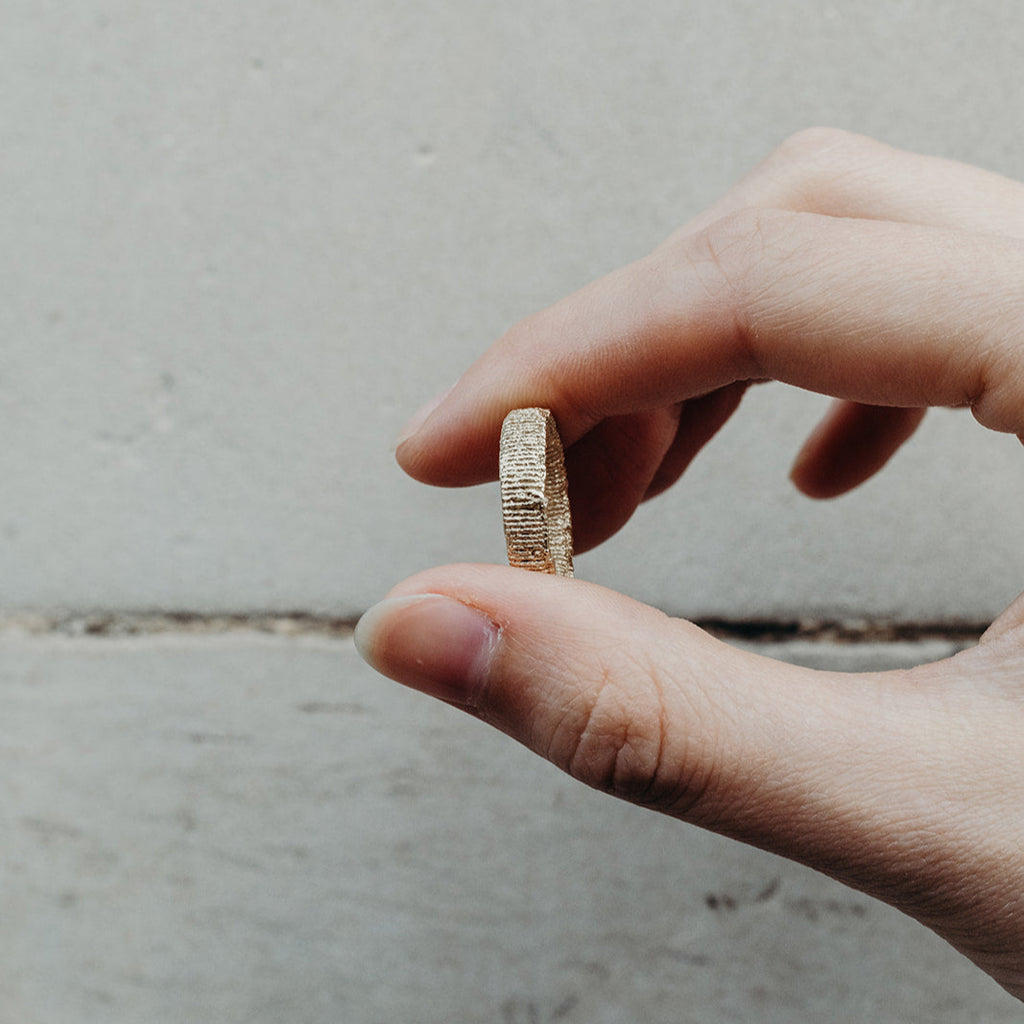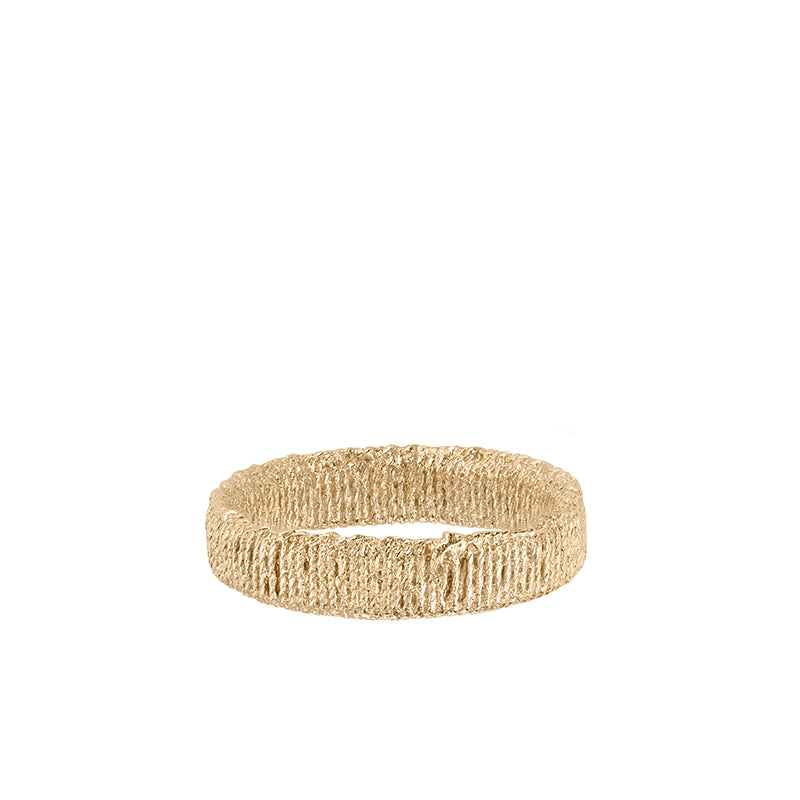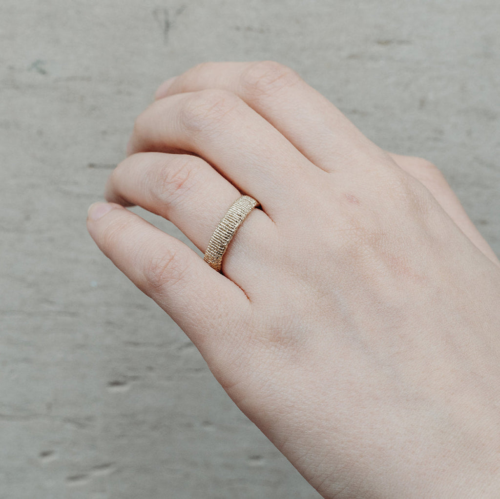 The Linea Band is a versatile gold ring, featuring a simple overstitch texture. Its clean lines and subtle detail make it an ideal choice for those seeking a timeless, elegant band.