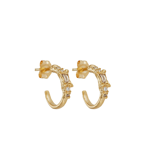Sculpted in 14 carat yellow gold and diamonds, each piece of jewellery is a fusion of intricacy and erosion. Historical shapes are deconstructed into sculptural fine jewellery, situated firmly within today's modern world.