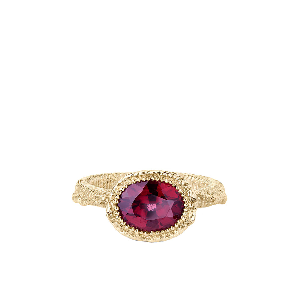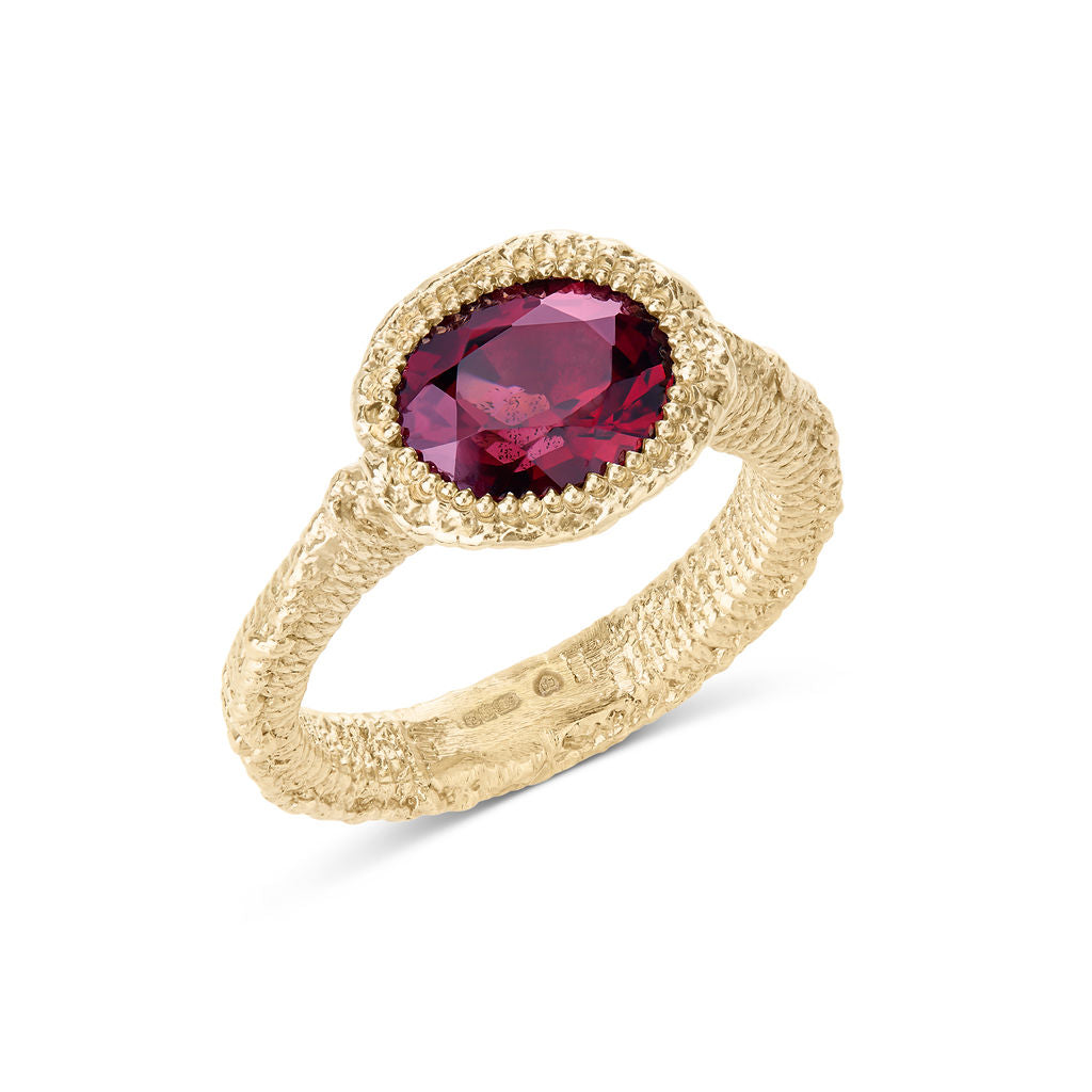 The Oval Solitaire Stitch Ring showcases a 2.5ct Tanzanian Moyo garnet encircled by a finely beaded bezel. The stitched band embodies Ebba Goring’s signature approach of transforming textile-inspired details into gold, lending the ring a sense of texture and expert craftsmanship. The deep red garnet contrasts harmoniously with the warmth of the gold, creating a design that feels both contemporary and timeless.