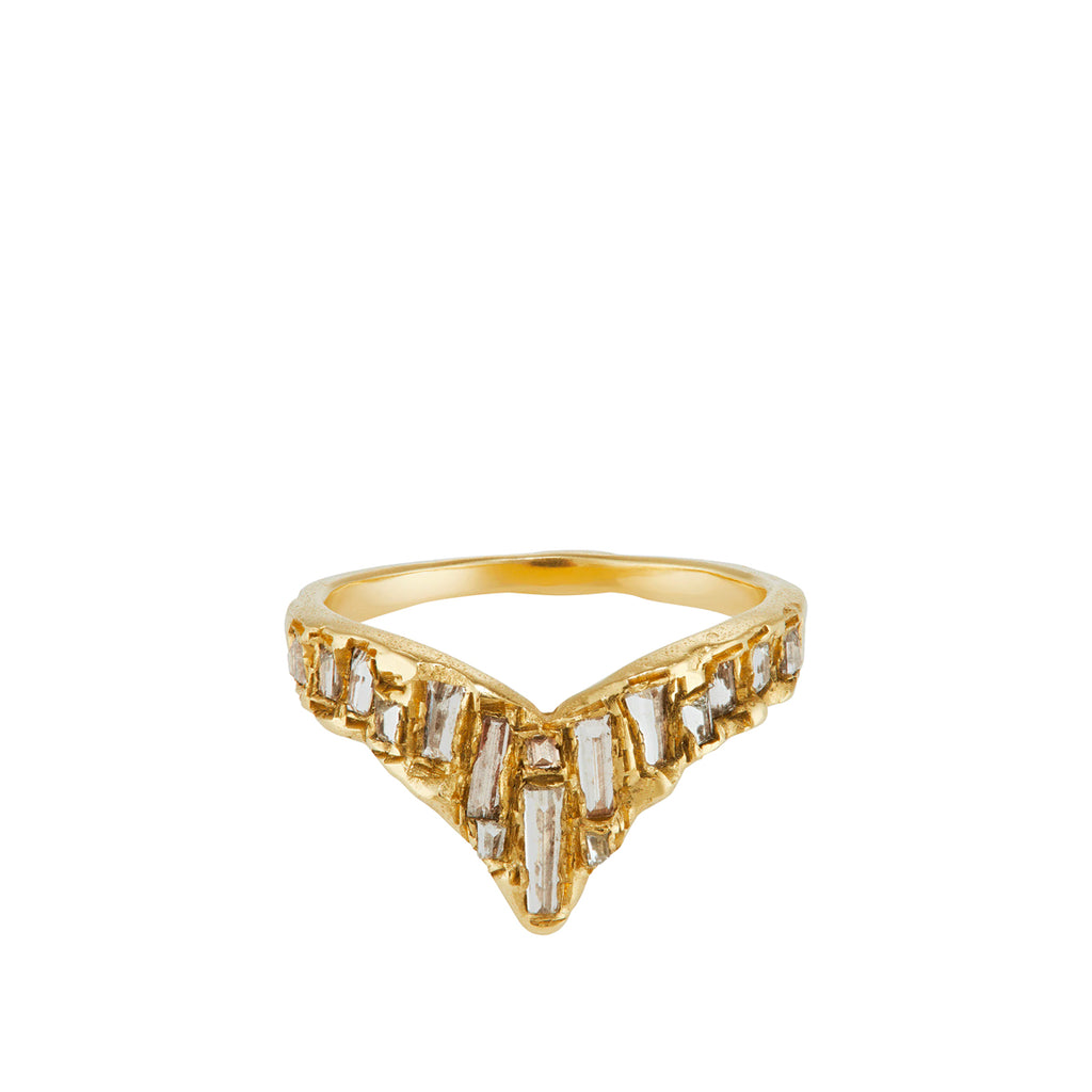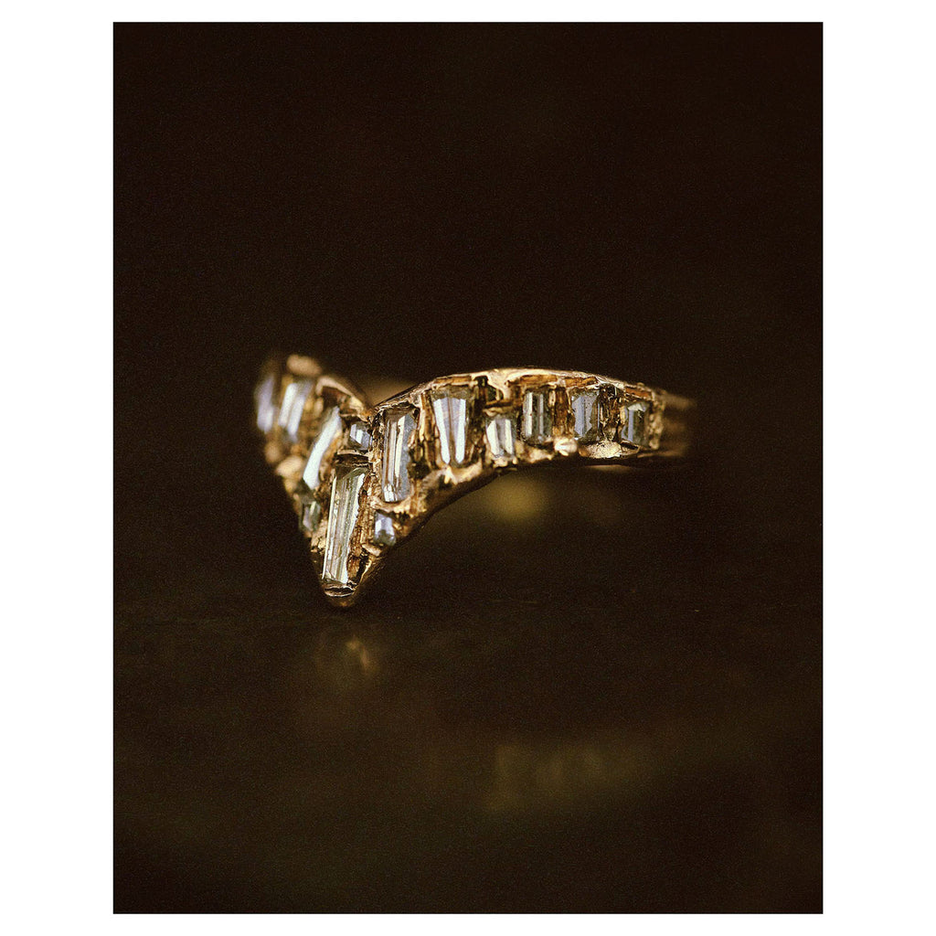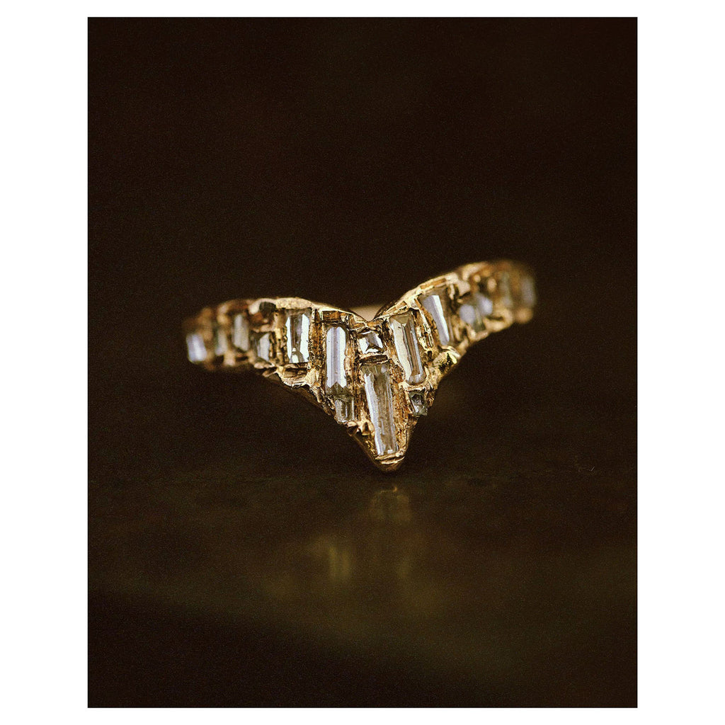 The X White Baguette Diamond Scatter Point V Shape Ring is inspired by the medieval jewellery hoards which have been found across Scotland.
