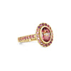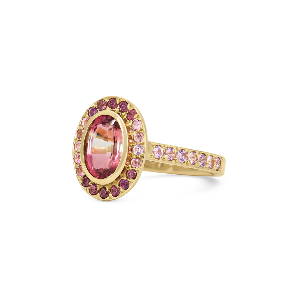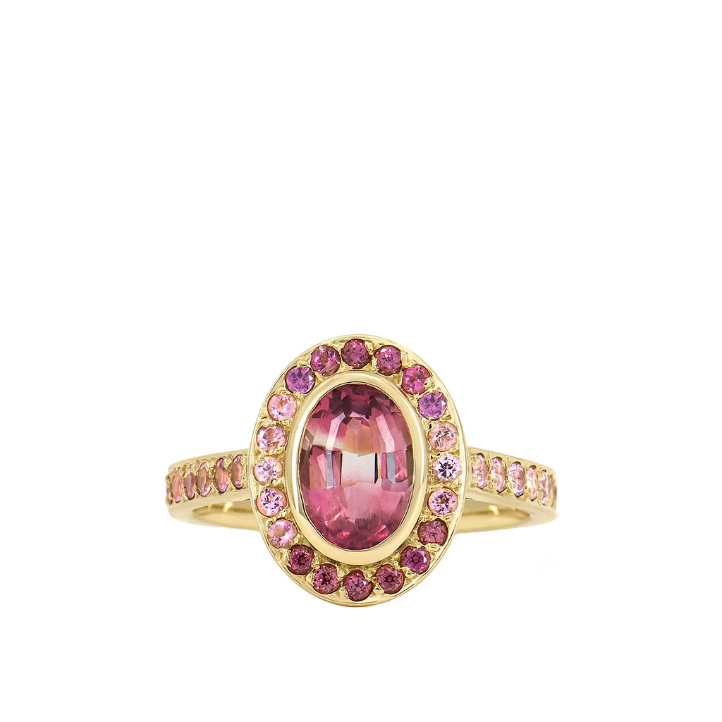 This Watermelon Sugar Ring features a beautiful oval tourmaline centre stone surrounded by an ombre gemstone halo made up of a blend of pink sapphires, tourmalines and rhodolites. Exploring a new shape in her Watermelon Sugar collection, Genevieve has captured the essence of playful elegance through this colourful twist on a traditional halo ring.