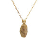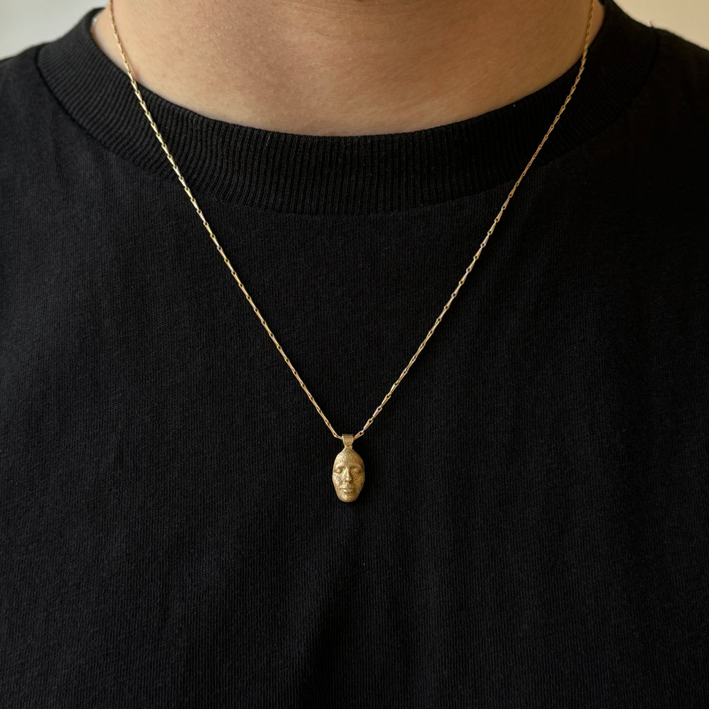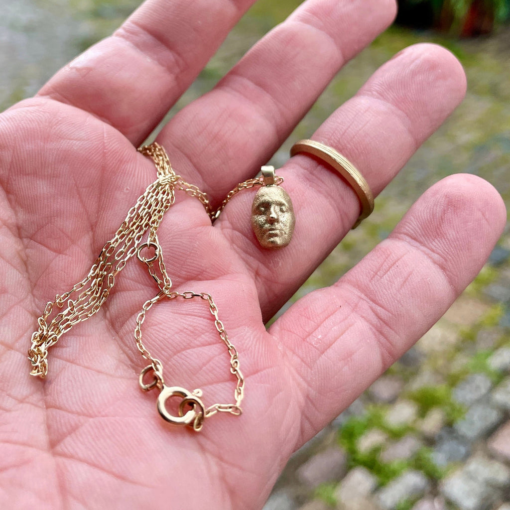 A handmade gold pendant with a delicately detailed sleeping face, perfect on its own or layered with other neckwear.