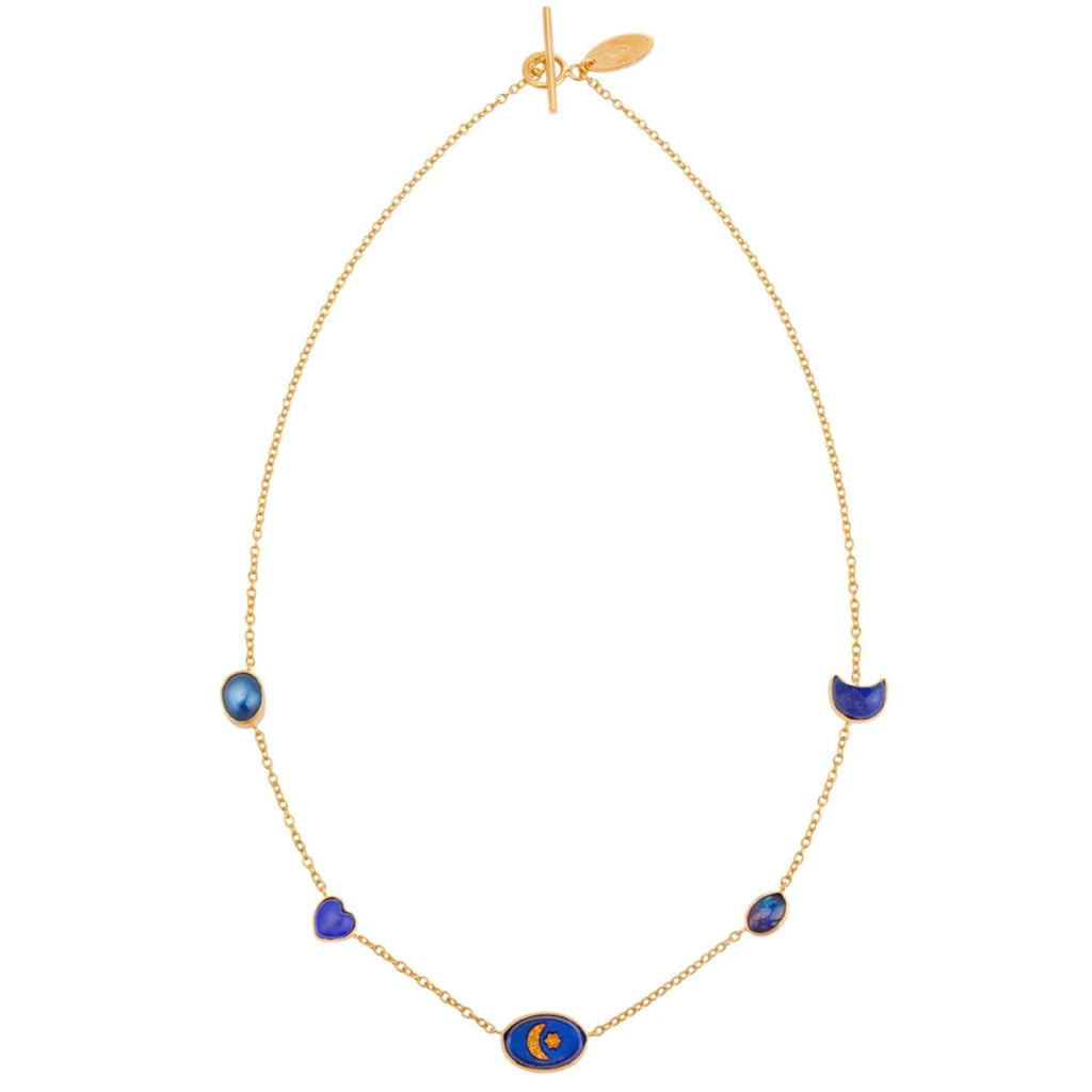 The Five Mini Charm Necklace is an exquisite presentation of lapis, opal, pearl, vintage glass and cabochon framed in fairtrade 18k gold plated silver.