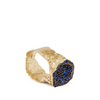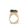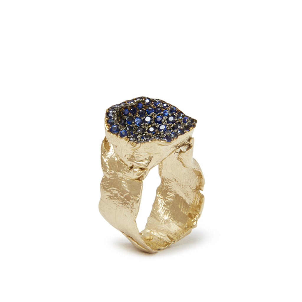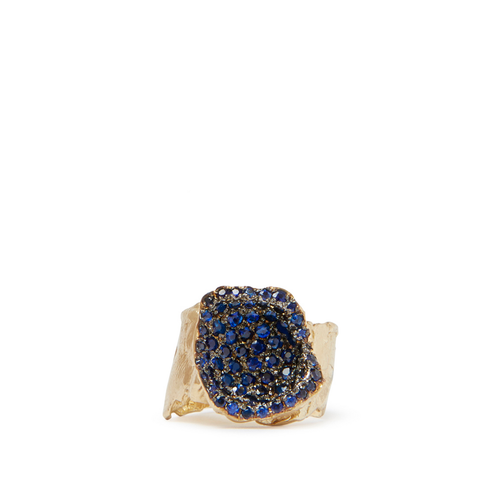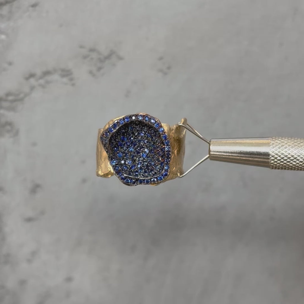 This two-tone 14k yellow gold ring features a crown resembling an open geode, adorned with a full pavé of blue sapphires set into black rhodium-plated yellow gold. The sculptural design of the ring adds a distinctive touch to any jewellery collection, creating a statement piece that remains understated enough for everyday wear.