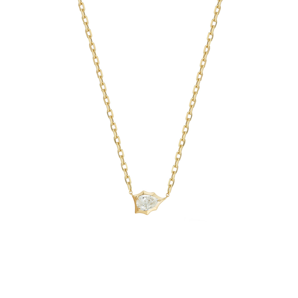 The Envoy Pendant is a classic staple in any neck stack. An everyday essential, the Envoy Solitaire Pendant delicately hangs on the neck by an 18 inch adjustable chain. Handcrafted in 18ct yellow gold and featuring 0.51tcw pear-shaped diamond set east-west in Jade's signature Alchemy setting.