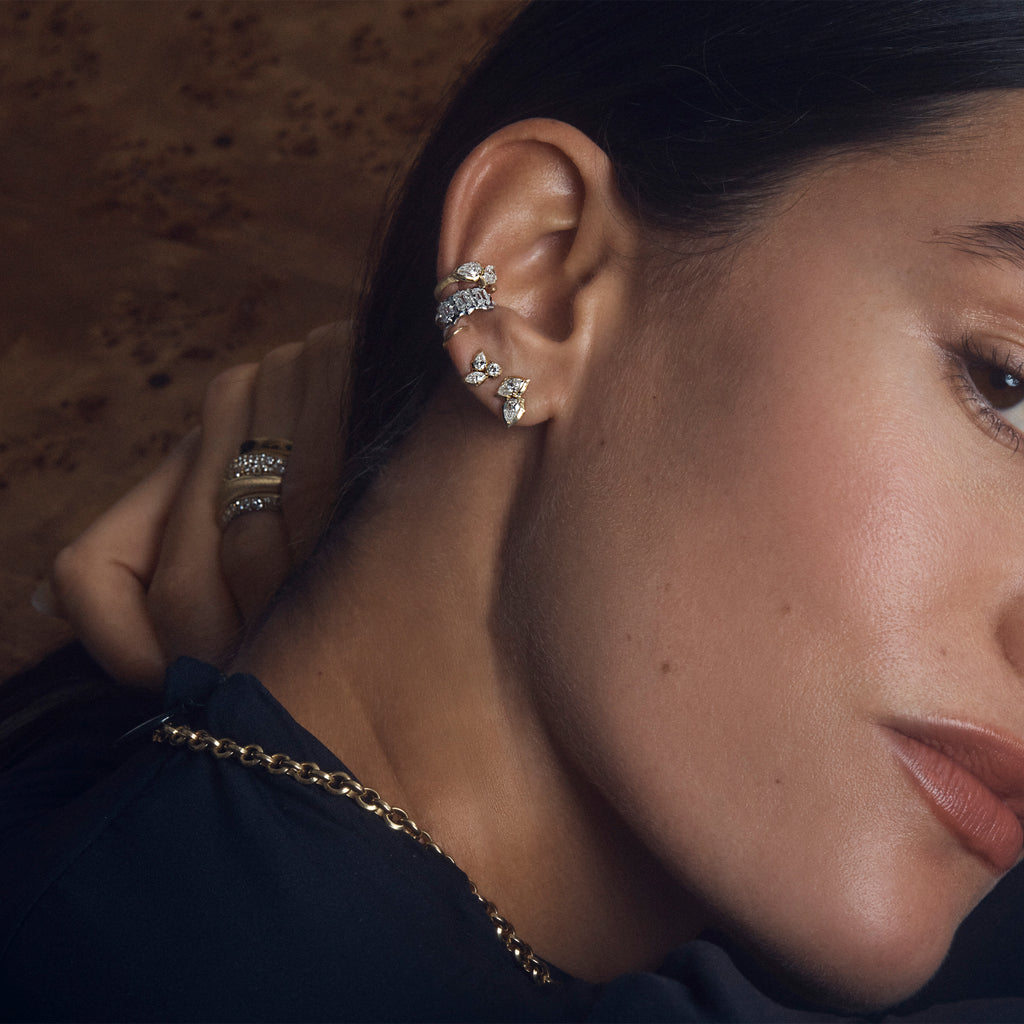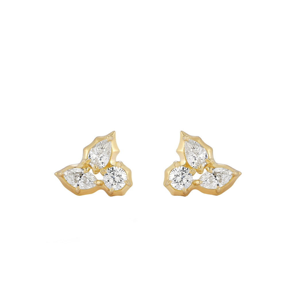 A new take on the classic cluster earring, the Posey Studs III are a modern yet feminine interpretation of the iconic silhouette. Handcrafted in 18ct yellow gold and featuring 0.38 tcw of marquise, round, and pear-shaped diamonds, these studs will easily elevate any earstack- no matter the occasion.
