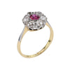 This ring features a vibrant 0.35-carat cushion-cut ruby, surrounded by a halo of antique old round-cut diamonds totaling 0.72 carats. Reminiscent of the iconic style popularised by Princess Diana, the design exudes timeless romance and elegance. The rich pinkish-red hue of the ruby is beautifully complemented by the sparkling diamonds, creating a captivating cluster that speaks of enduring love. The yellow metal ring band is stamped ‘18ct PLAT’, which suggests a combination of yellow gold and platinum, adding to the character of this finely made piece.