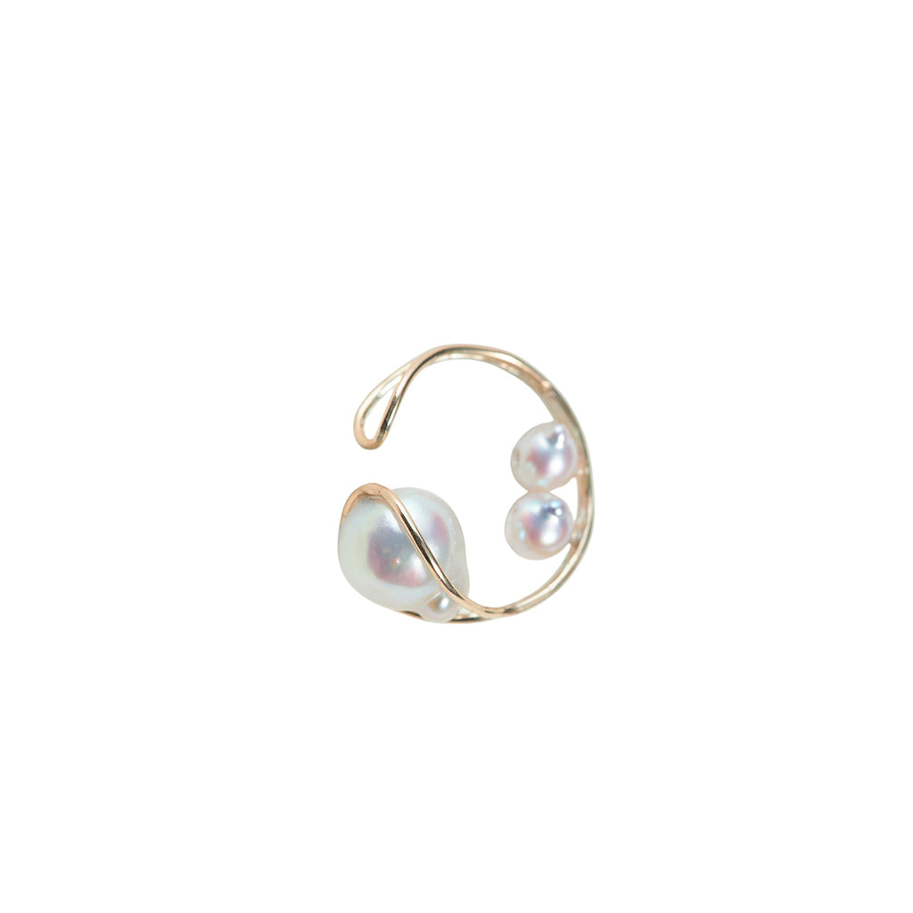 A delicate band of smooth gold wire is set with three lavender-hued baby Akoya baroque pearls. The pearls are unique and irregular in their form, and the cuff is gently sculpted to fit the ear. It is sold as one piece and can be paired with other pieces in Mariko's collection.
