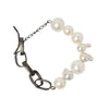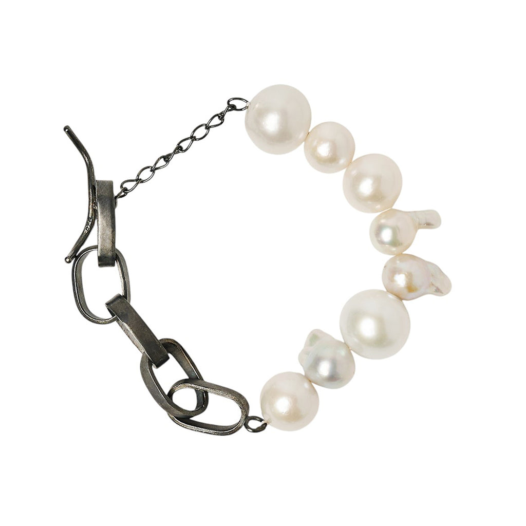 The Opaque bracelet is made from lustrous Akoya baroque pearls, Freshwater pearls and a few spiky Akoya pearls to add texture. The pearls are arranged irregularly which is typical of Mariko's work. The pearls have been sourced from a local pearl farm near Nagasaki, close to Mariko's hometown. The clasp is made from oxidised silver and as time goes by it will age well.