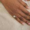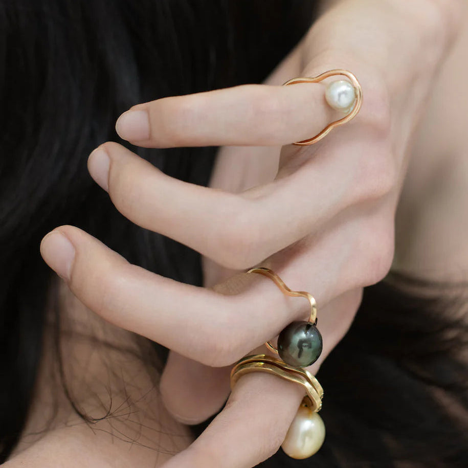 Minimalistic but striking, an Akoya pearl is set into the curves of 9ct yellow gold wire. The ring is eye-catching yet easy to wear on the pinky finger, and is a personal favourite of Mariko's.