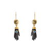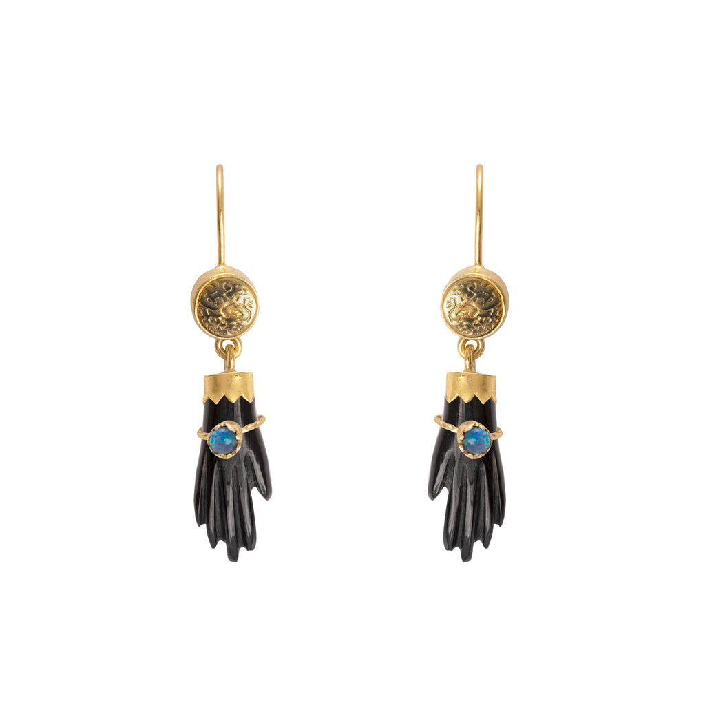 The Black Hand With Bracelet hook earrings feature a pair of hand carved black horn hands, with opal stone set movable bracelets attached to them. The hands hang elegantly from a golden ear hook finished with an antique button. Please note the 'bracelets' are able to move slightly. The earrings are plated in 18k fairtrade gold. These earrings make a real impact yet are incredibly lightweight.