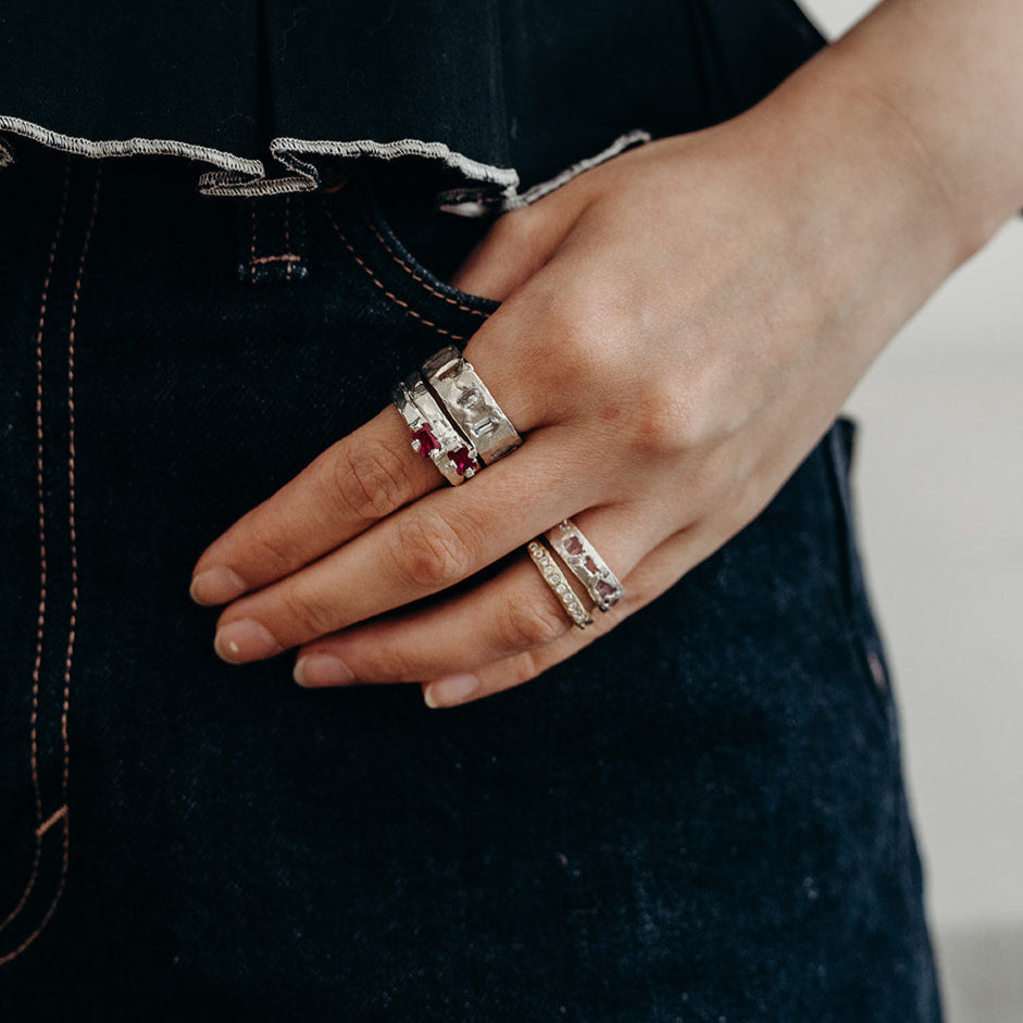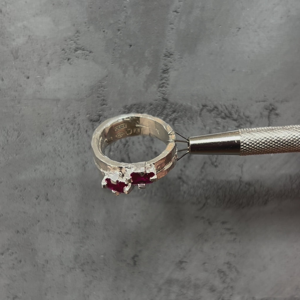A sculptural double-band ring cast in recycled sterling silver, set with two large baguette-cut rubies held in organic claws. The bands are fused into one, creating an understated asymmetry. Raw and expressive, with a softened, time-worn feel.