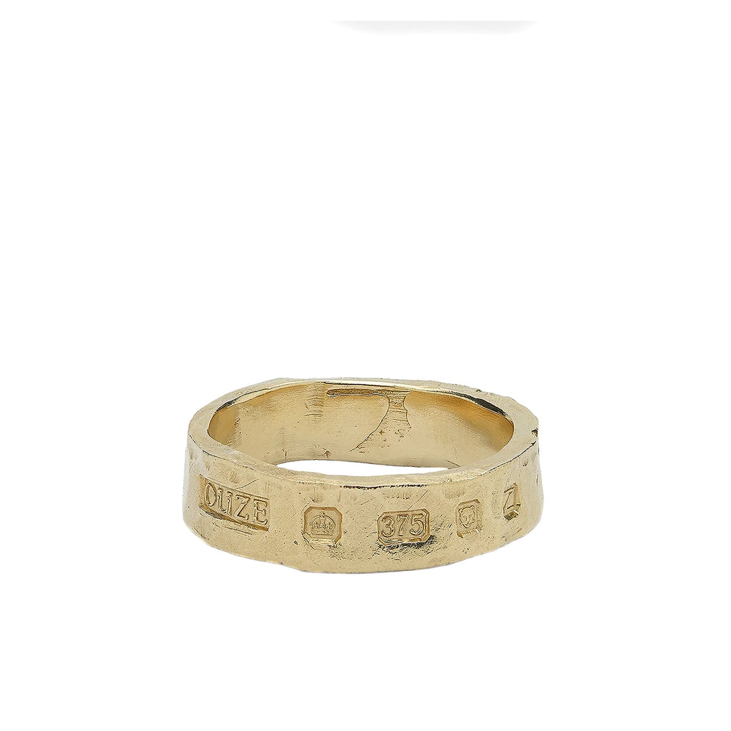 Crafted in solid 9k gold, this band carries a bold character with its chunky profile and deeply struck hallmark impressions. The irregular, hand-finished surface gives the piece a raw edge while celebrating the traditional language of British assay marks.