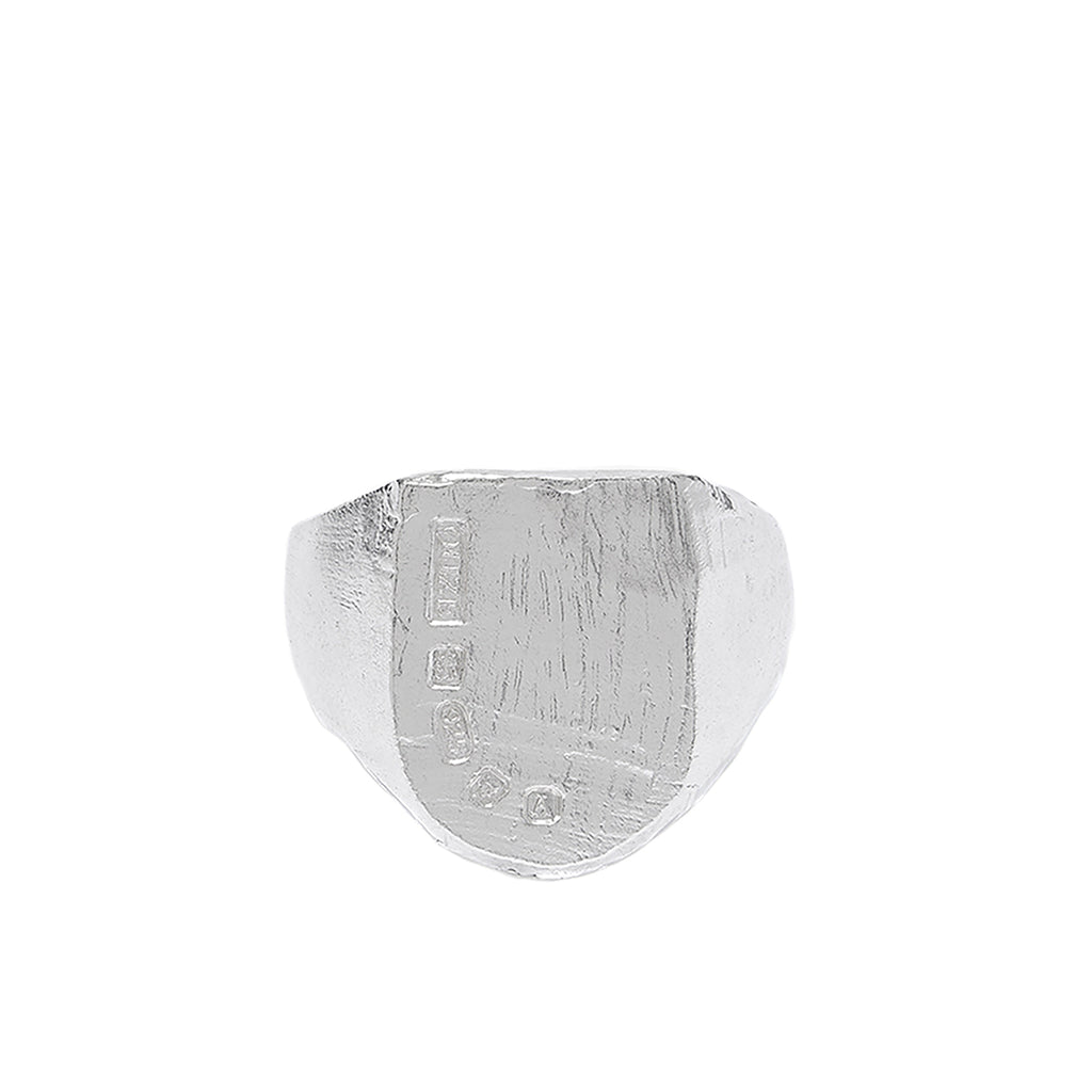 A silver signet ring with a broad shield-shaped face and an organic surface. Stamped with hallmarks along the front, the design combines a strong form with raw textural detail.