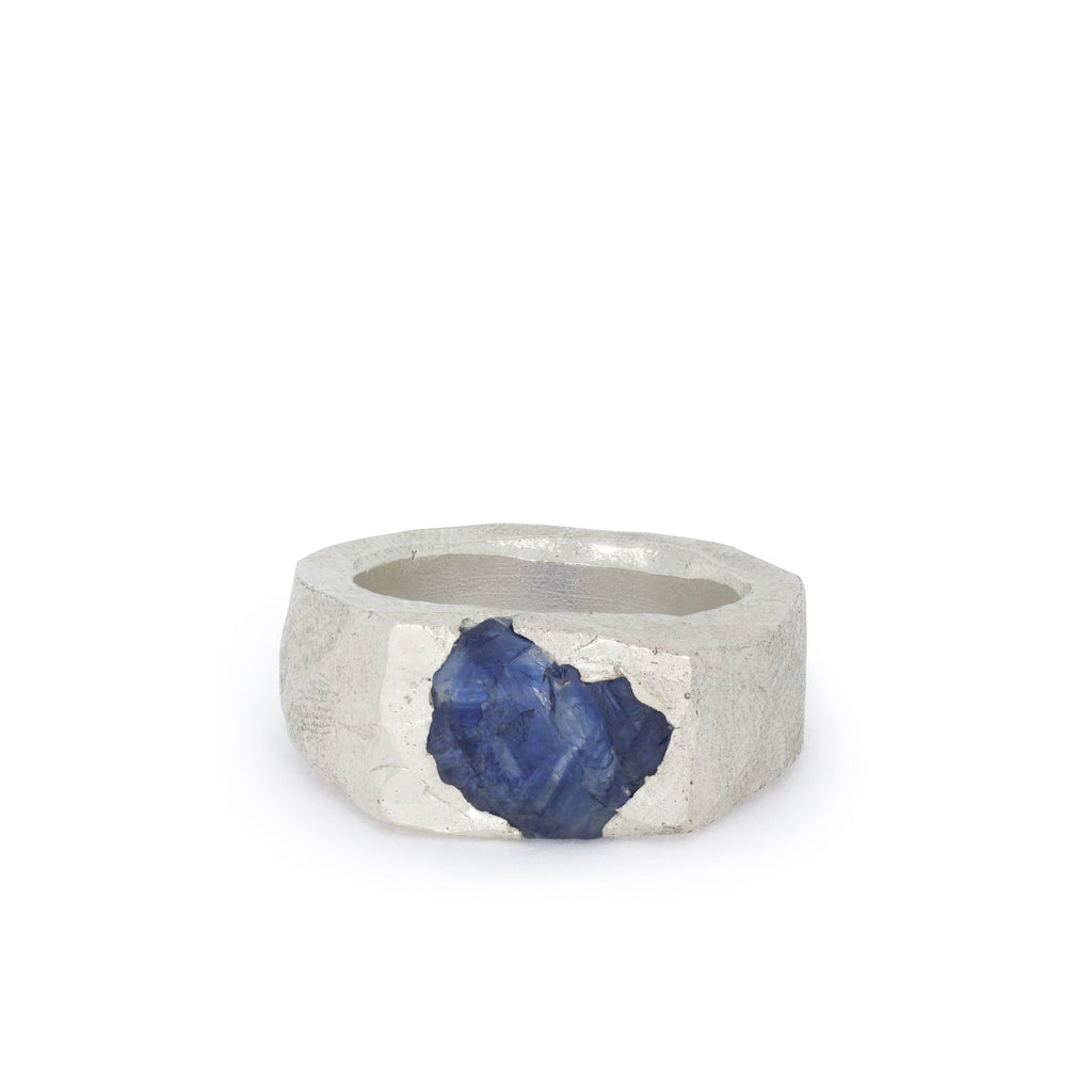 The Sapphire Una Signet ring features a striking blue sapphire, taking centre stage on the rugged face of the ring.
