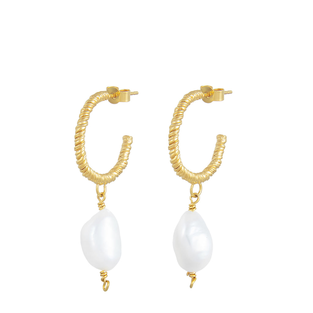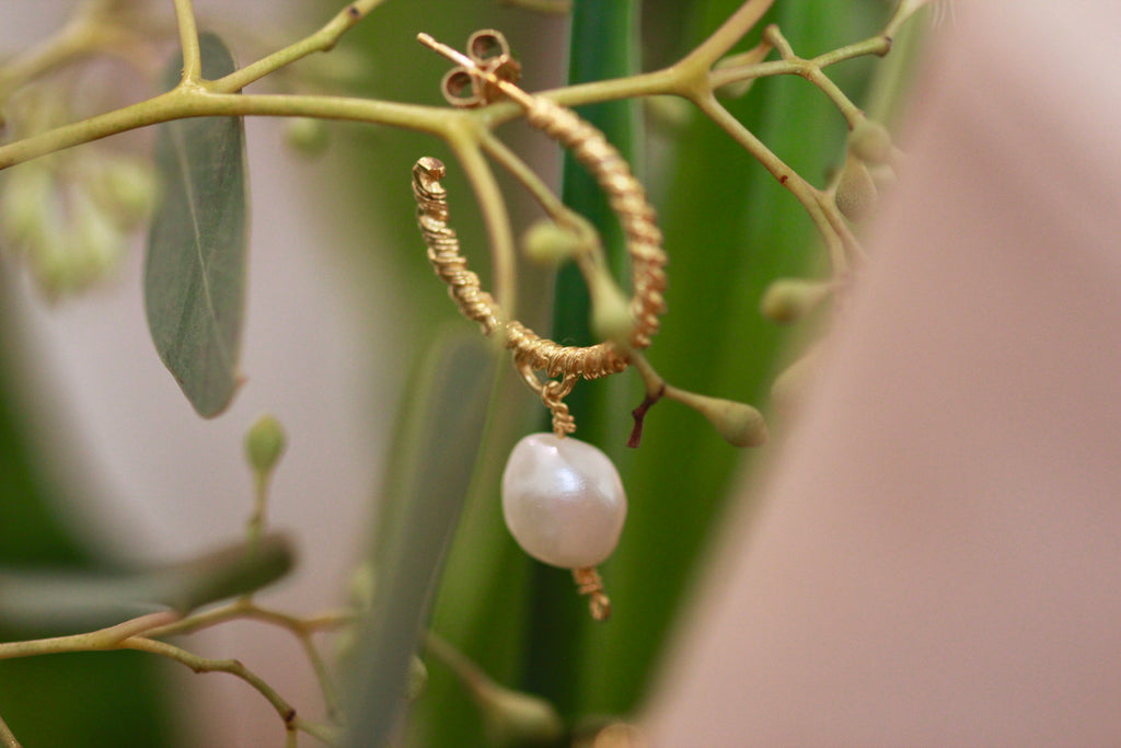 The Medium Gold Organic Twisted Pearl Hoops feature twisted detail gold vermeil plated silver hoop earrings with natural freshwater baroque pearl drops. Handcrafted by Natalie Perry in London from sustainably-sourced recycled sterling silver.