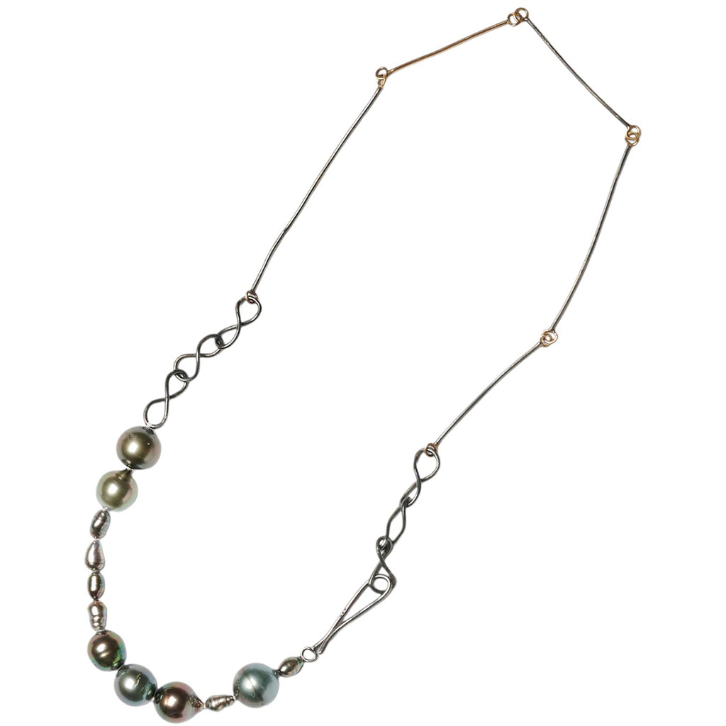 The Uzu necklace combines Tahitian pearls of varying sizes and shapes, with a handmade chain of different style links. The handcrafted links of are made of gold and oxidised sterling silver, and have a textural and organic finish. It is a perfect addition to a layered look.