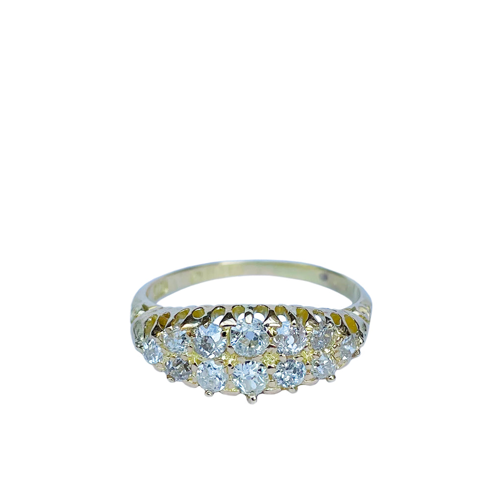 This exquisite 18ct yellow gold ring showcases a radiant cluster of old round-cut diamonds, totalling 0.64 carats. The intricate setting adds a refined elegance, allowing light to enhance the diamonds’ brilliance. A gracefully tapered band complements the design, creating a timeless piece that exudes charm and sophistication.