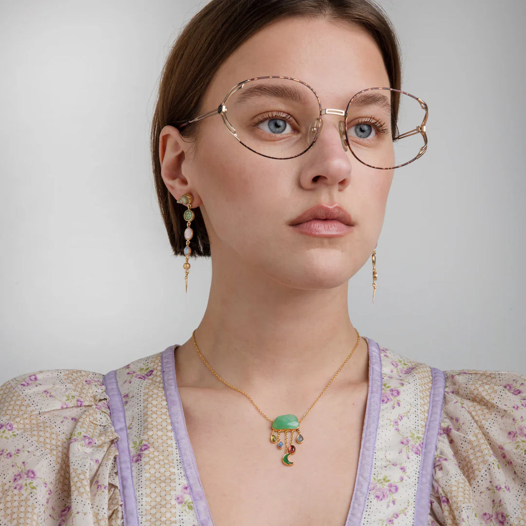 Materials: Fairtrade 18k gold plating on recycled silver, cameo, opal, pearl, rhodochrosite, shell and vintage glass