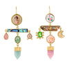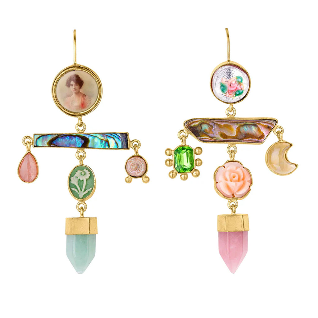 A joyful balancing act of colour and form, these earrings combine found and precious elements in a harmonious mismatched pair. Portrait miniatures, carved gemstones, abalone, and vintage cameos are composed in gold-plated silver structures that celebrate curiosity, nostalgia, and craftsmanship.